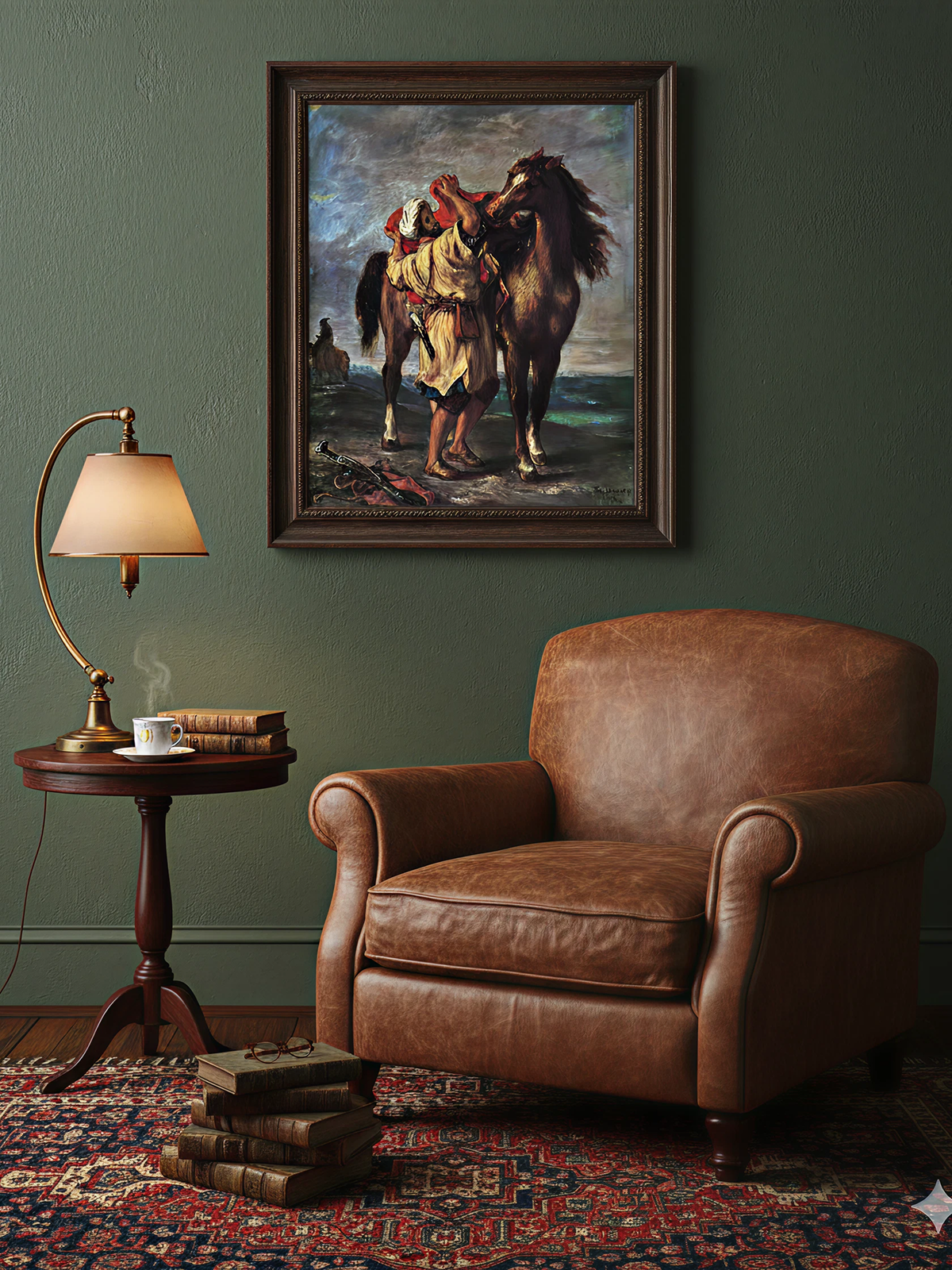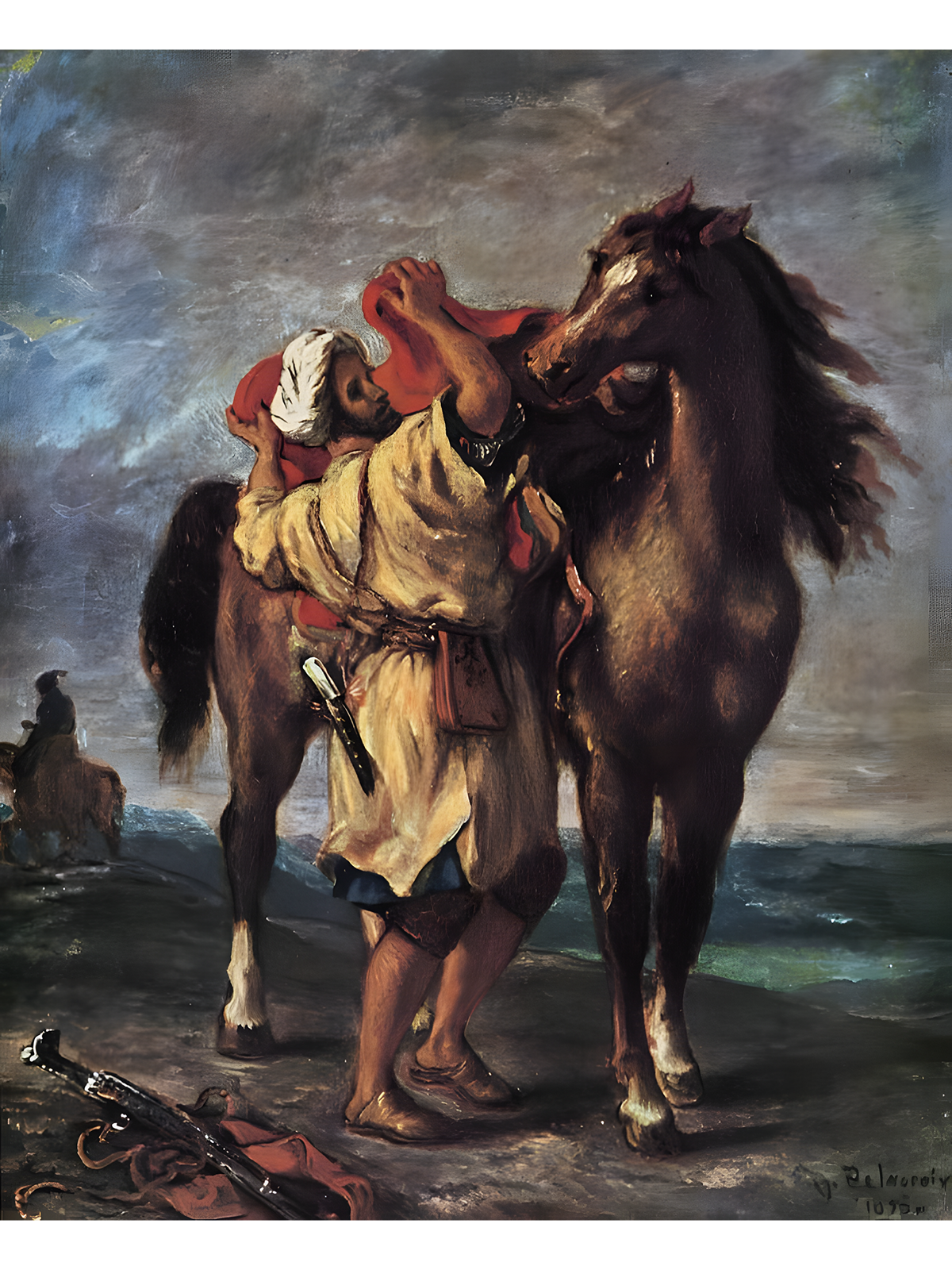 A Moroccan Saddling a Horse, de 1855, é uma obra de Eugène Delacroix. Ela é, sem dúvida, representativa do Romantismo francês. Nesta tela, o artista retrata um marroquino preparando seu cavalo. Seu objetivo principal é explorar o exotismo, o movimento e as cores vibrantes. Para isso, Delacroix se baseia em suas viagens ao norte da África. Consequentemente, a obra transmite uma sensação de autenticidade e fascínio.