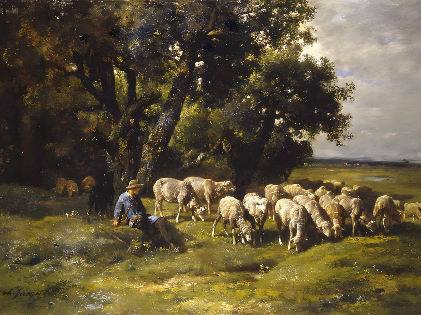 A Shepherd with His Flock, de 1813, é uma obra de Charles Émile Jacque. Ela é, sem dúvida, representativa do realismo francês do século XIX. Nesta tela, o artista retrata um pastor conduzindo seu rebanho. Seu objetivo principal é capturar a vida rural com atenção aos detalhes. Para isso, Jacque utiliza uma composição que transmite uma atmosfera serena. Consequentemente, a obra celebra a simplicidade e a ordem da vida no campo.