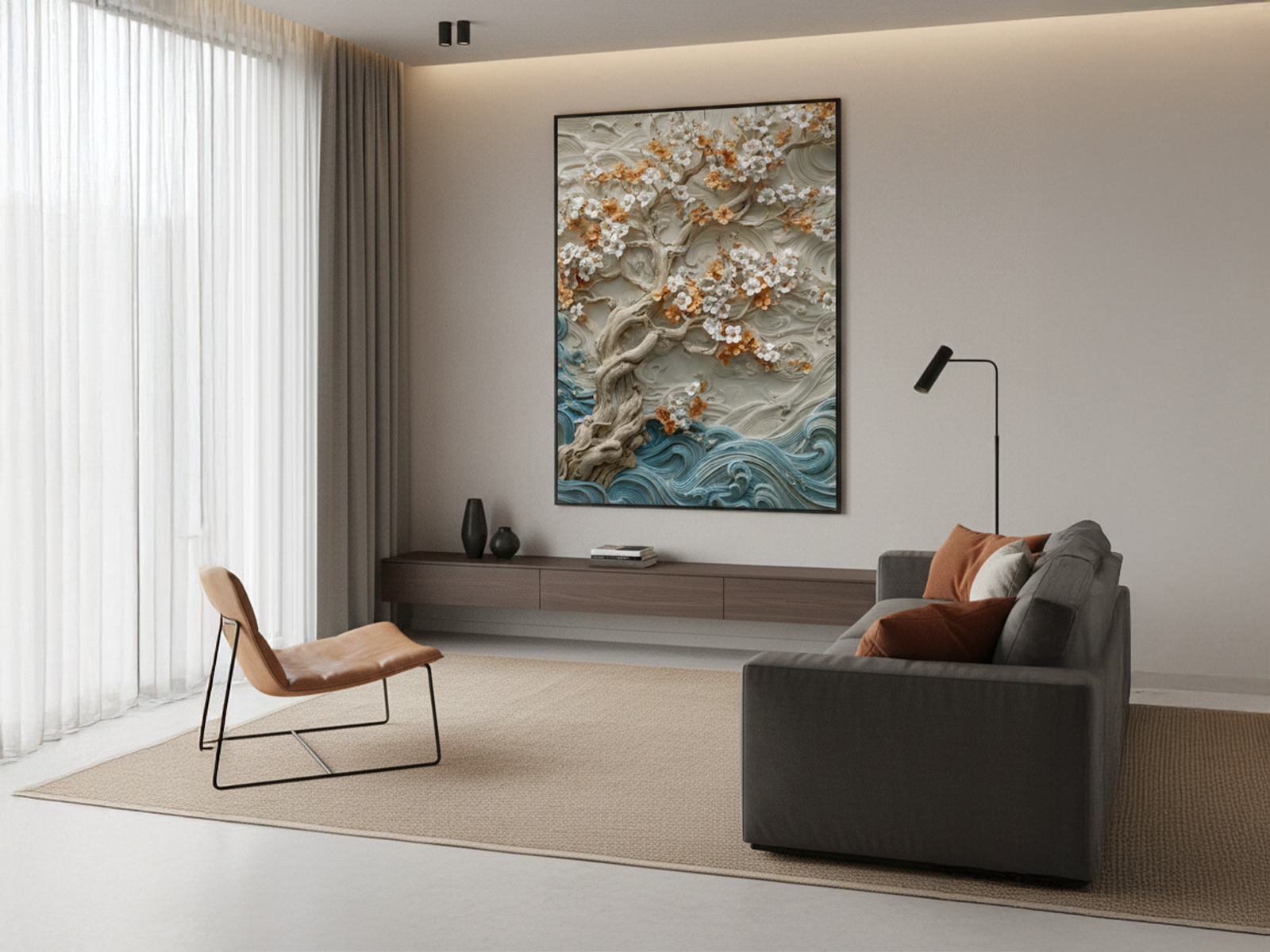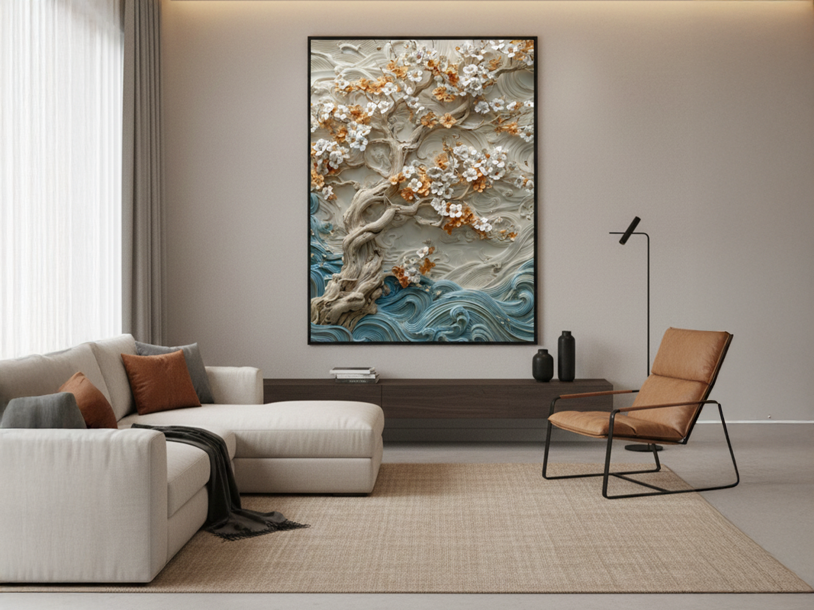 A partir dessa união entre força e suavidade, a imagem comunica resiliência e beleza duradoura. “Árvore Ancestral em Relevo” impressiona devido ao efeito tridimensional muito marcado, que cria profundidade e convida o olhar a explorar cada curva. Além disso, as texturas do tronco e das ondas são ricas, densas e altamente detalhadas. Por esse motivo, este quadro decorativo se torna um elemento de grande impacto na sala de estar, trazendo personalidade imediata ao ambiente.