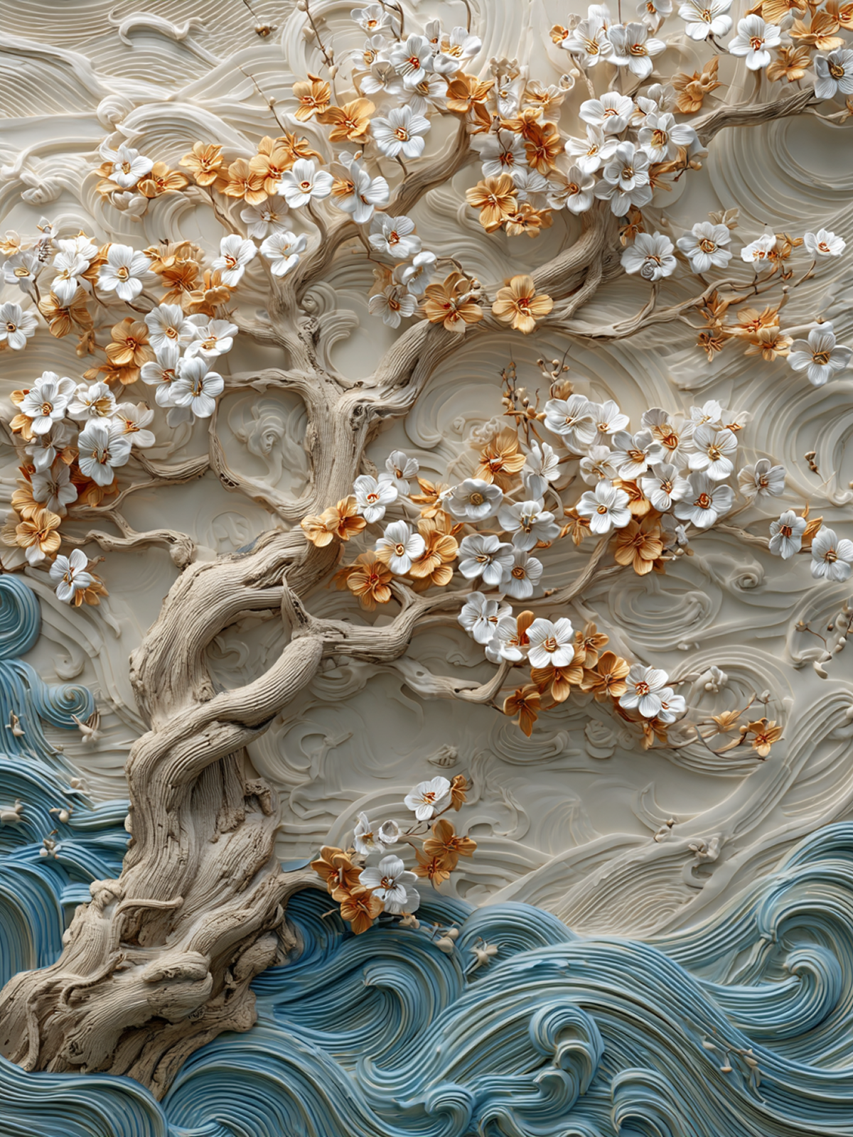 “Árvore Ancestral em Relevo” é uma obra majestosa, vibrante e cheia de movimento natural. Este quadro de árvore revela um tronco grosso e retorcido que simboliza idade, memória e força interior. Logo no primeiro olhar, o fundo apresenta redemoinhos intensos em azul e branco, lembrando um mar inquieto ou um vento poderoso que percorre a paisagem. A árvore permanece firme, coberta por flores brancas e douradas que iluminam a cena e acrescentam delicadeza ao vigor da composição.