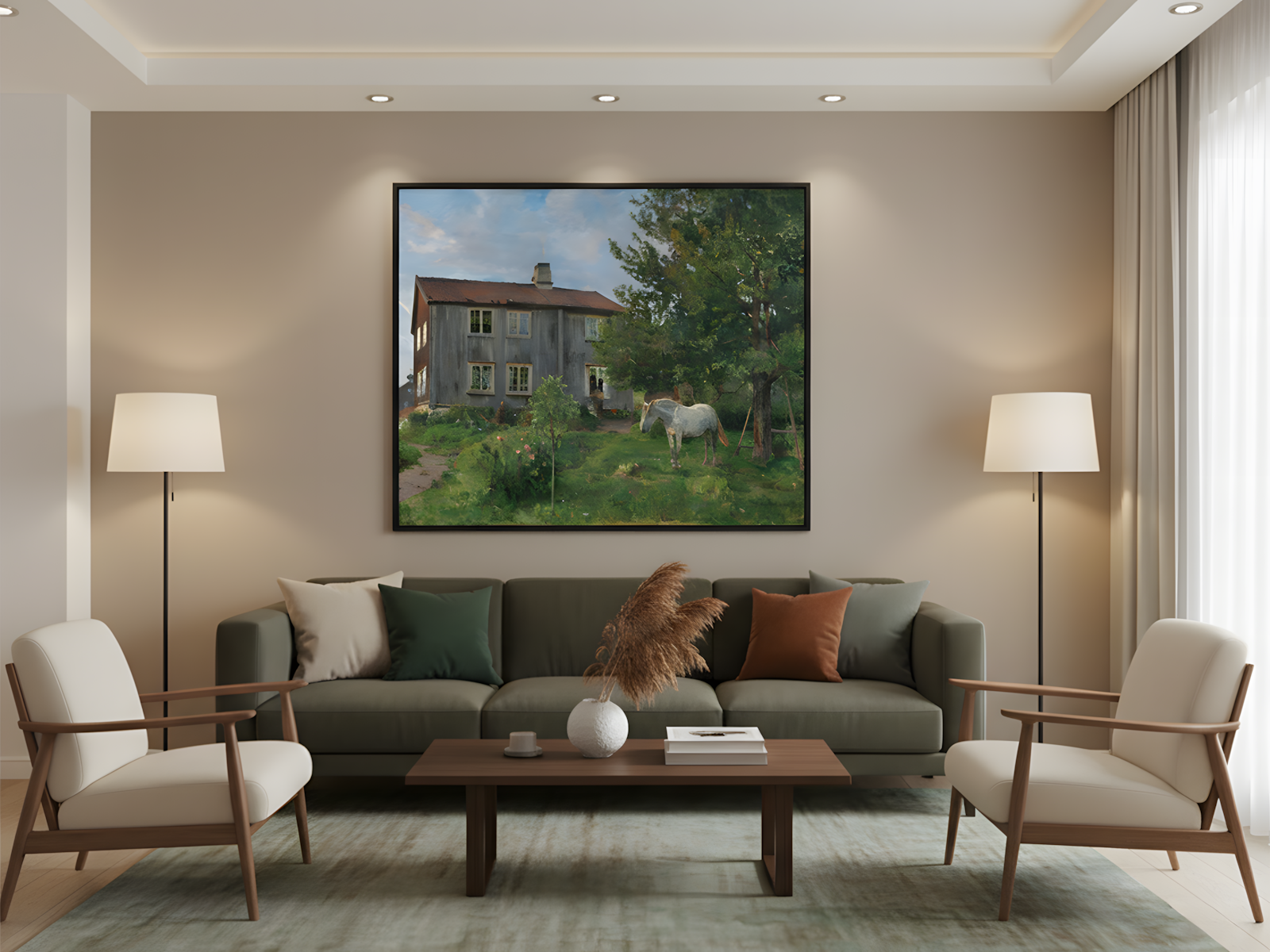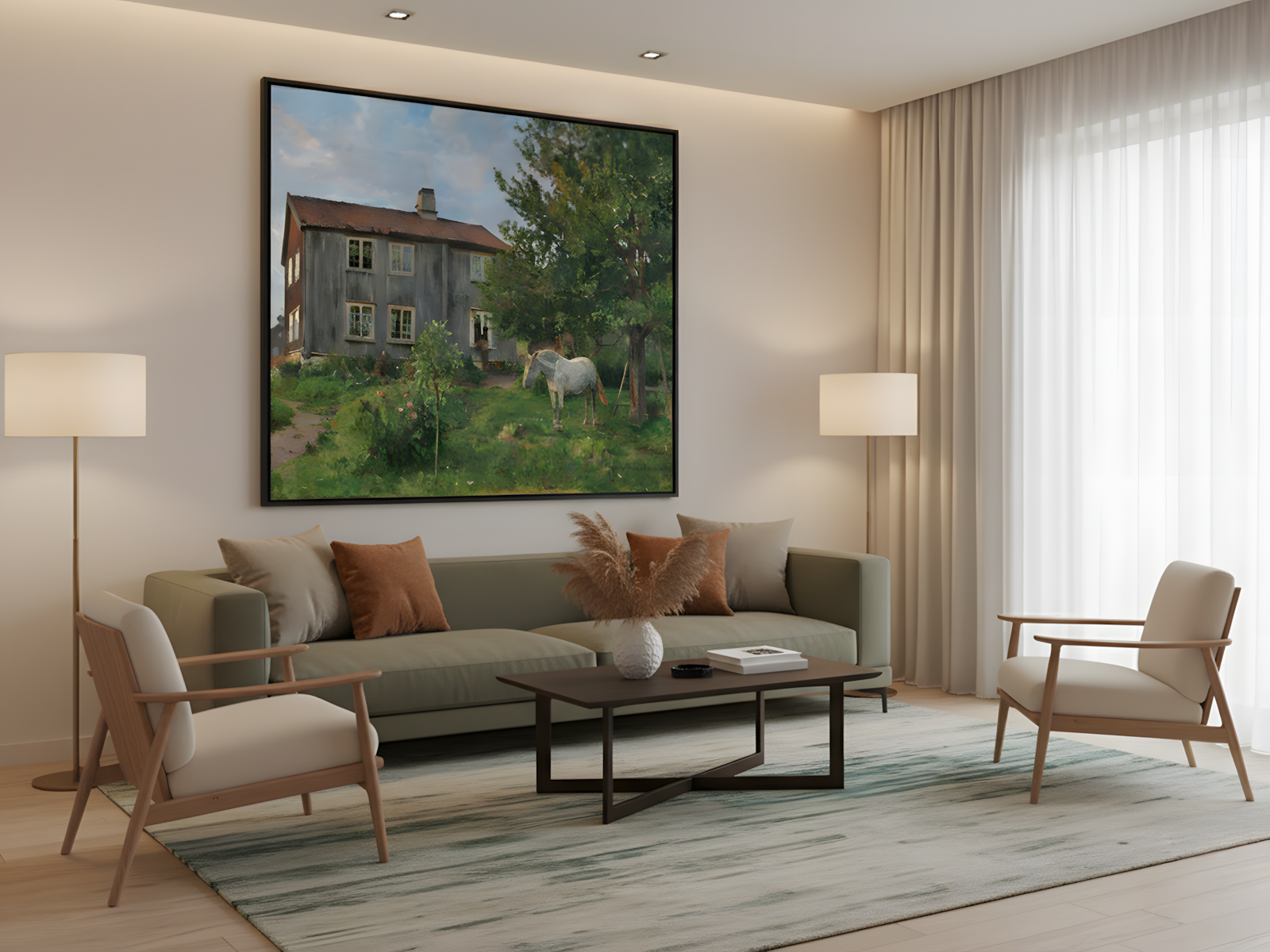 O artista utiliza a técnica de óleo sobre tela com grande maestria. Ele cria, por exemplo, uma luz natural que define o volume e a profundidade. Além disso, At The Farm, Ulvin organiza os edifícios e as figuras de forma equilibrada. Essa estrutura transmite uma grande sensação de espaço e harmonia. A paleta de cores, por sua vez, combina tons terrosos e verdes. Dessa forma, ela reforça o realismo e a conexão com a Natureza.