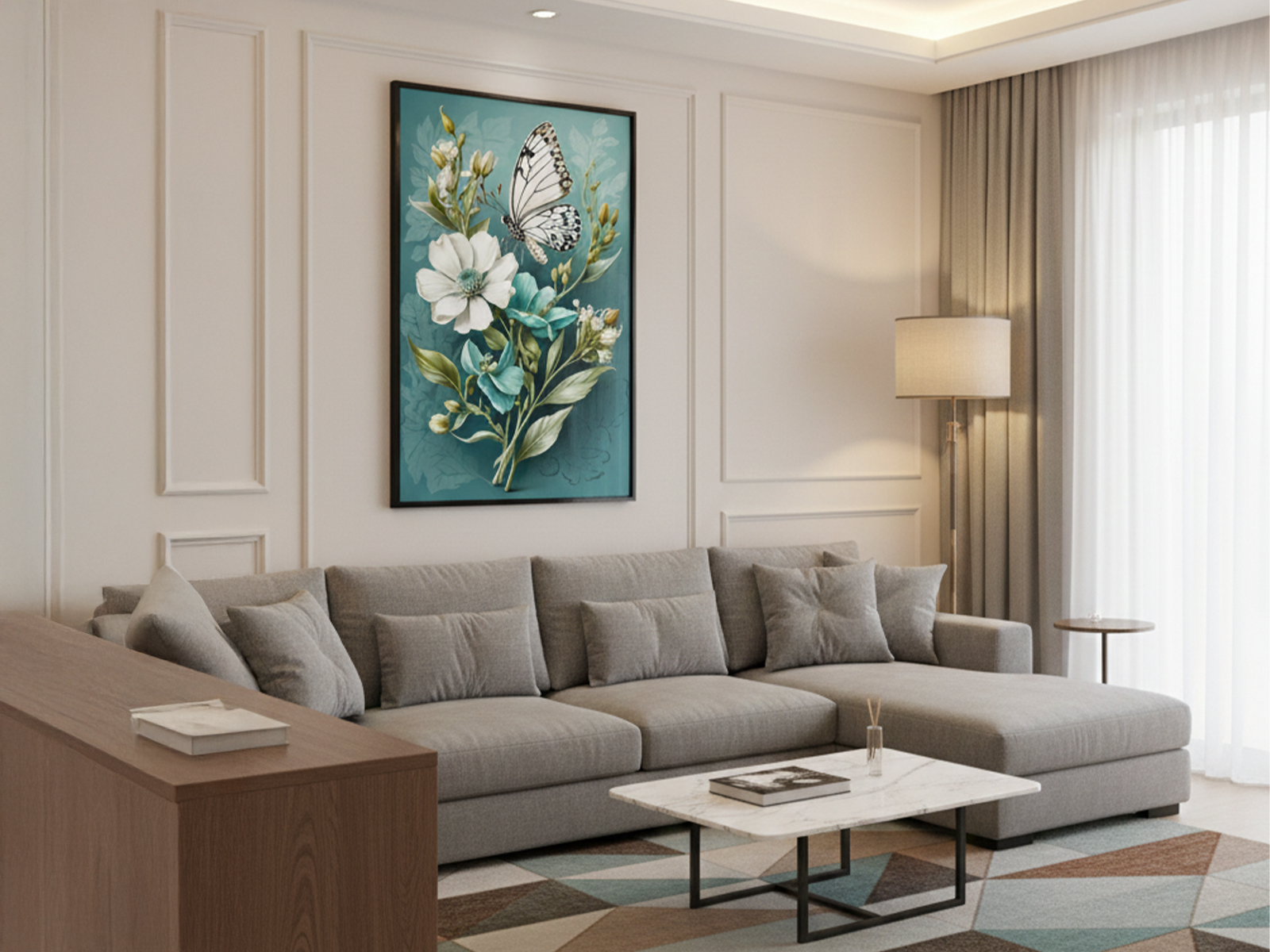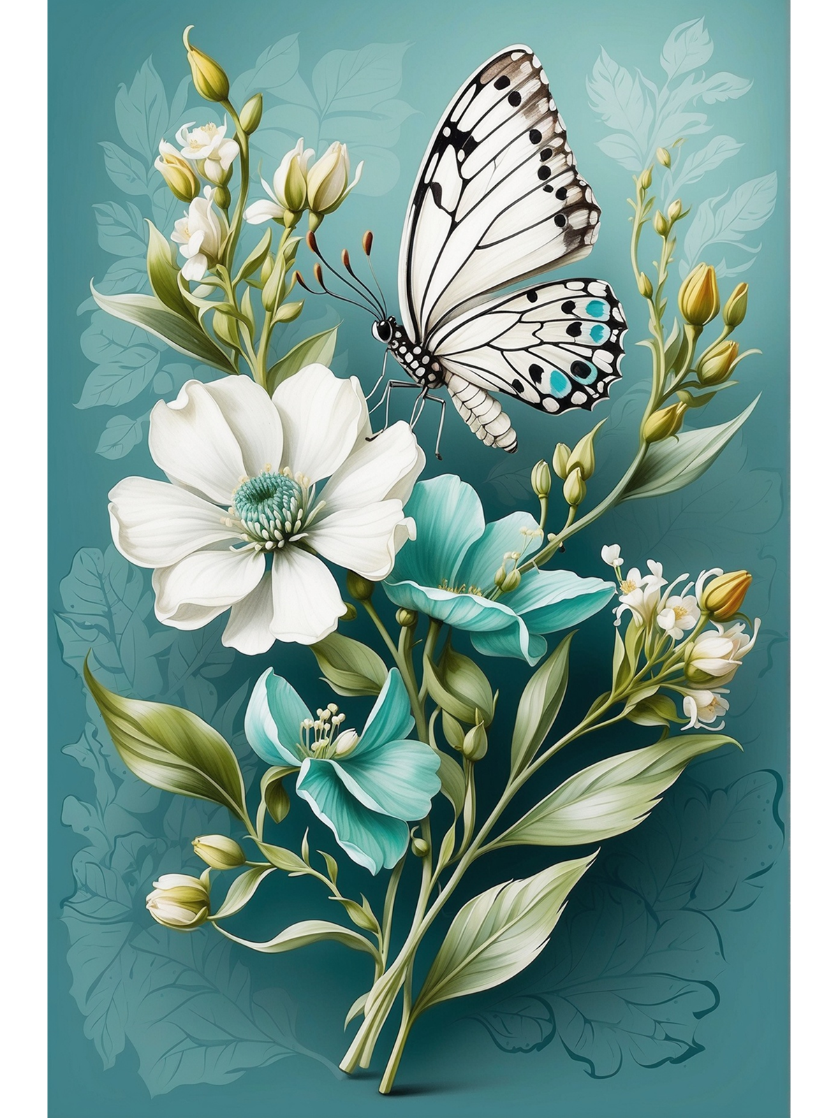 “Borboleta Botânica” revela a elegância da natureza de forma delicada e direta. A composição segue um formato vertical que alonga o olhar e cria leveza. Uma borboleta branca com manchas pretas pousa em flores serenas e bem definidas. A paleta monocromática reforça o clima de calma. Tons de verde-azulado, branco e creme trabalham em conjunto e criam um visual fresco. Portanto, a obra transmite harmonia desde o primeiro contato.