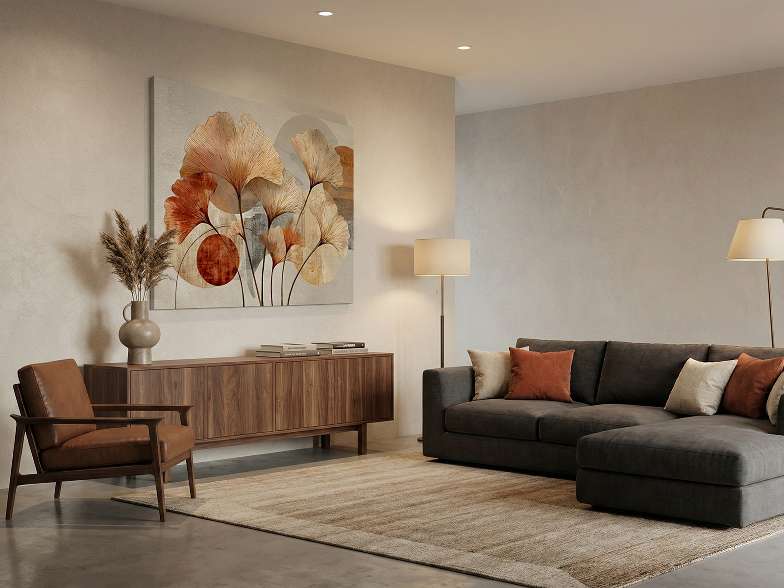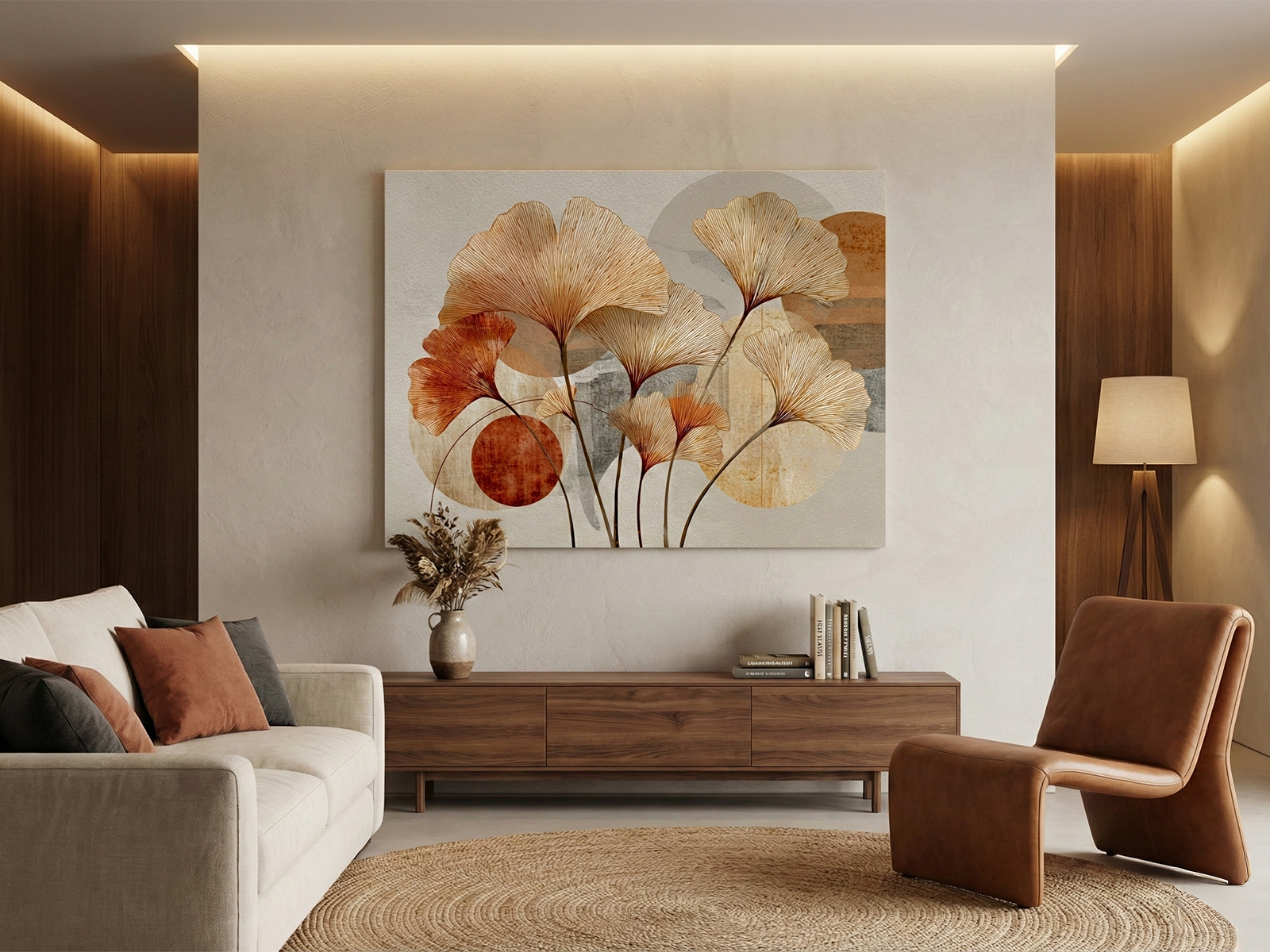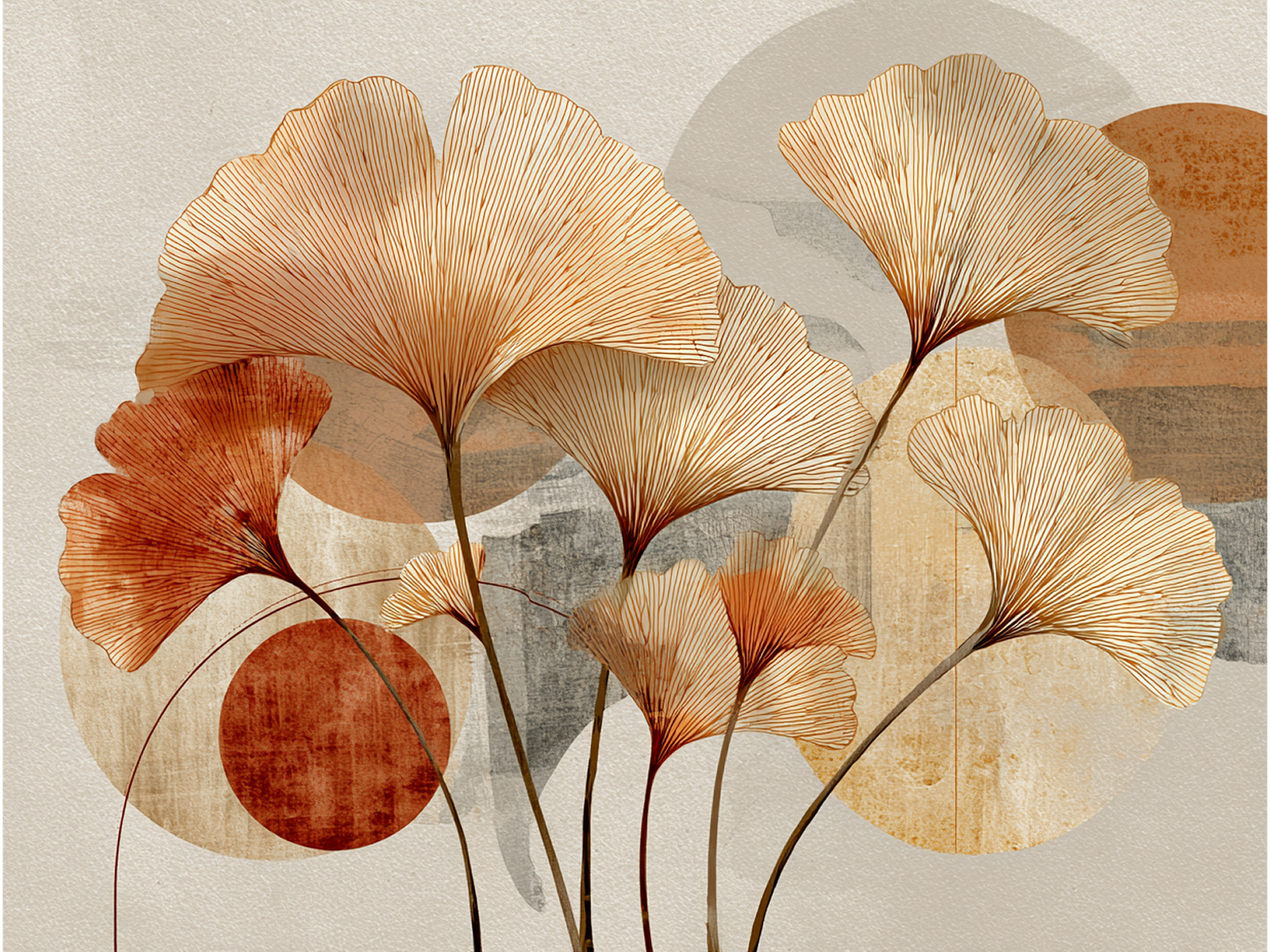“Composição Ginkgo Biloba” apresenta um design botânico moderno que valoriza formas naturais com um toque contemporâneo. Este quadro de folhas reúne um grupo harmonioso de Ginkgos que se destacam pela leveza e pela elegância visual. Logo no primeiro olhar, as folhas exibem texturas lineares finas e tons quentes variados que enriquecem a composição. Tons de cobre, dourado e bege se sobrepõem de maneira artística, criando uma paleta rica e acolhedora. Além disso, o fundo mistura elementos de cimento queimado com círculos geométricos abstratos, produzindo um contraste sofisticado entre o orgânico e o urbano.