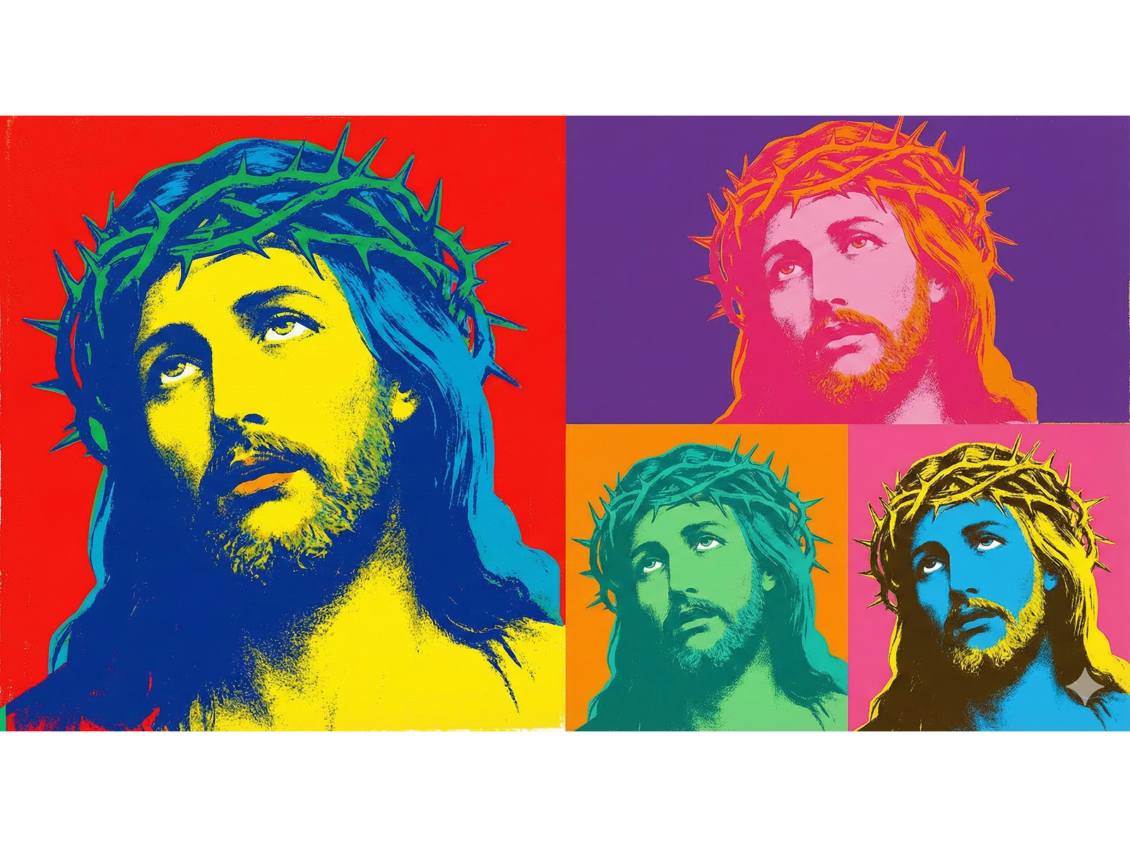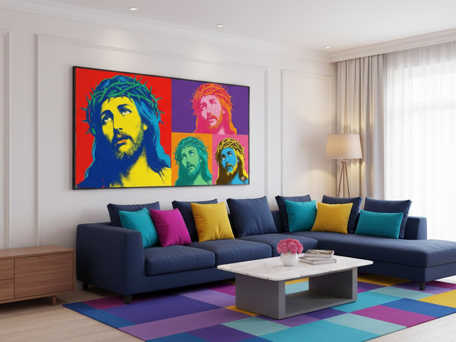 “Cristo Pop Colors” explode em criatividade. O quadro moderno apresenta quatro versões do rosto de Jesus Cristo e traz uma estética claramente inspirada na Pop Art clássica. A obra usa cores saturadas e contrastantes, aproximando-se do estilo de artistas que transformaram figuras comuns em ícones culturais. Vermelho, amarelo, azul, roxo e verde surgem em combinações ousadas que reforçam o impacto visual. Cada painel oferece uma experiência única, como se revelasse novas interpretações a cada olhar.