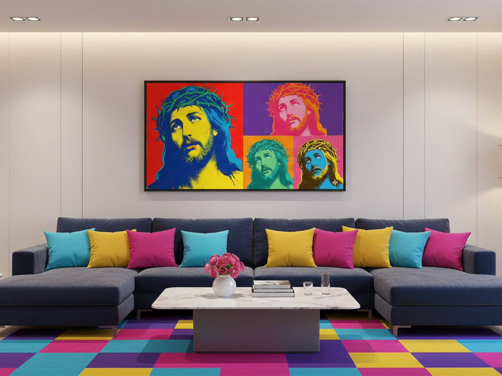 Quem busca um quadro decorativo marcante encontra aqui uma excelente escolha. A peça se adapta muito bem a escritórios criativos, salas de estar modernas ou qualquer espaço que valorize arte com energia visual. Em suma, o quadro celebra a fé com alegria cromática e transforma espiritualidade em uma experiência artística vibrante e ousada.