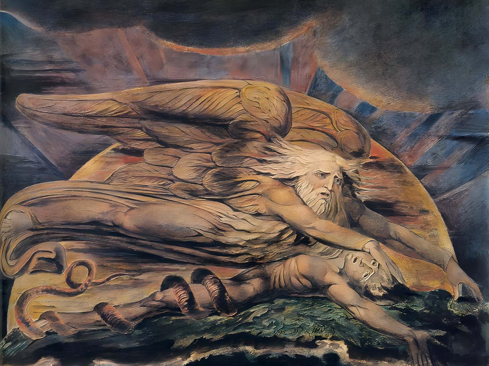 Elohim Creating Adam, de 1795, é uma obra de William Blake. Ela é, sem dúvida, um exemplo emblemático do Romantismo inglês. Nesta tela, o artista e poeta retrata o momento da criação de Adão de forma visionária. Seu objetivo principal é explorar a espiritualidade e o simbolismo bíblico. Para isso, Blake utiliza sua imaginação mística e uma expressividade única. Consequentemente, a obra transmite uma energia dramática e até mesmo angustiante.