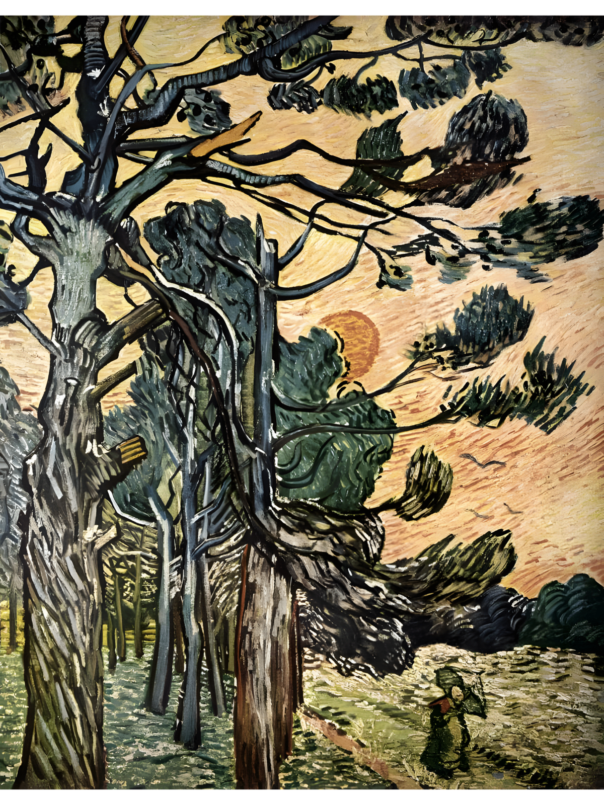Fir-woods at Sunset, de novembro de 1889, é uma obra fascinante de Vincent van Gogh. Ele a pintou durante sua fase em Saint-Rémy. A tela retrata um denso bosque de pinheiros iluminado pela luz do pôr do sol. O objetivo do artista era explorar a cor, a luz e a textura da cena. Com isso, ele buscava transmitir uma atmosfera ao mesmo tempo serena e intensa, uma dualidade comum em seu trabalho.