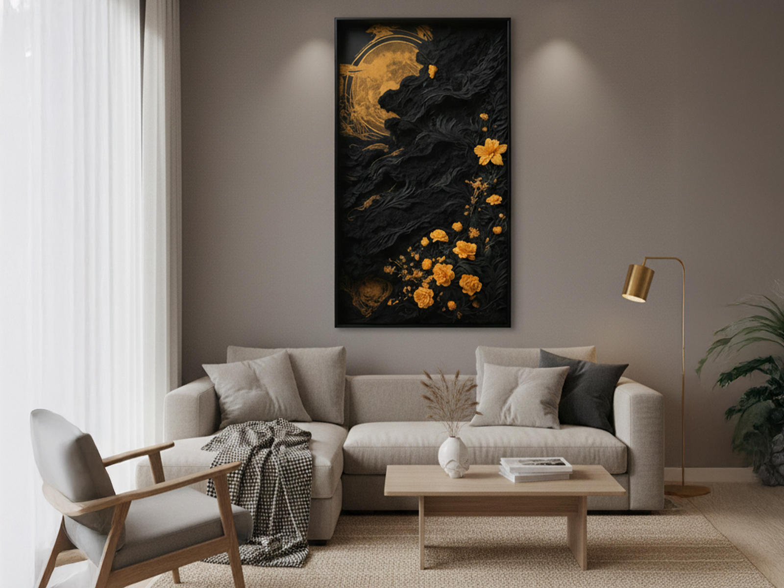 Este quadro decorativo opera como uma peça de declaração, capaz de transformar o espaço sem esforço. Ele desperta curiosidade e conduz o olhar para seus detalhes luminosos. A mistura entre elementos orgânicos e efeitos metálicos segue tendências contemporâneas de decoração. Em síntese, “Flores Douradas no Escuro” reúne intensidade, delicadeza e sofisticação, criando um impacto visual memorável e marcante.