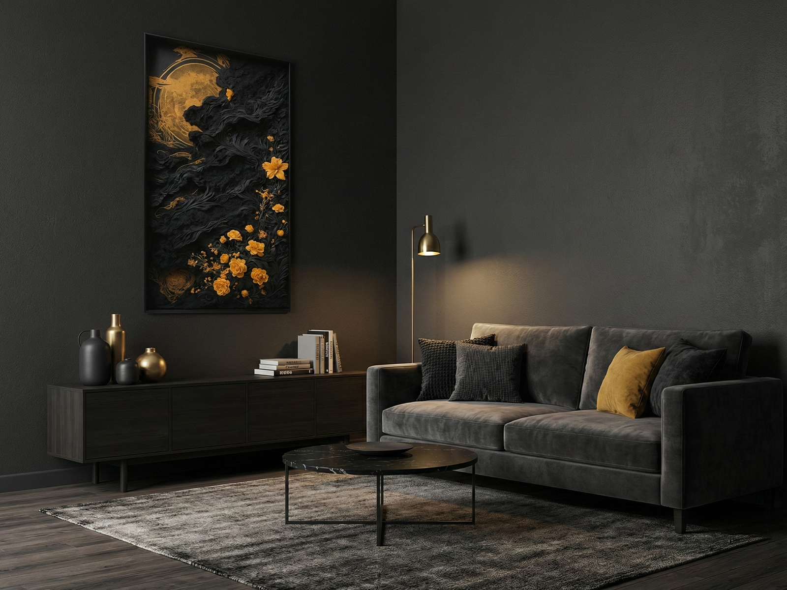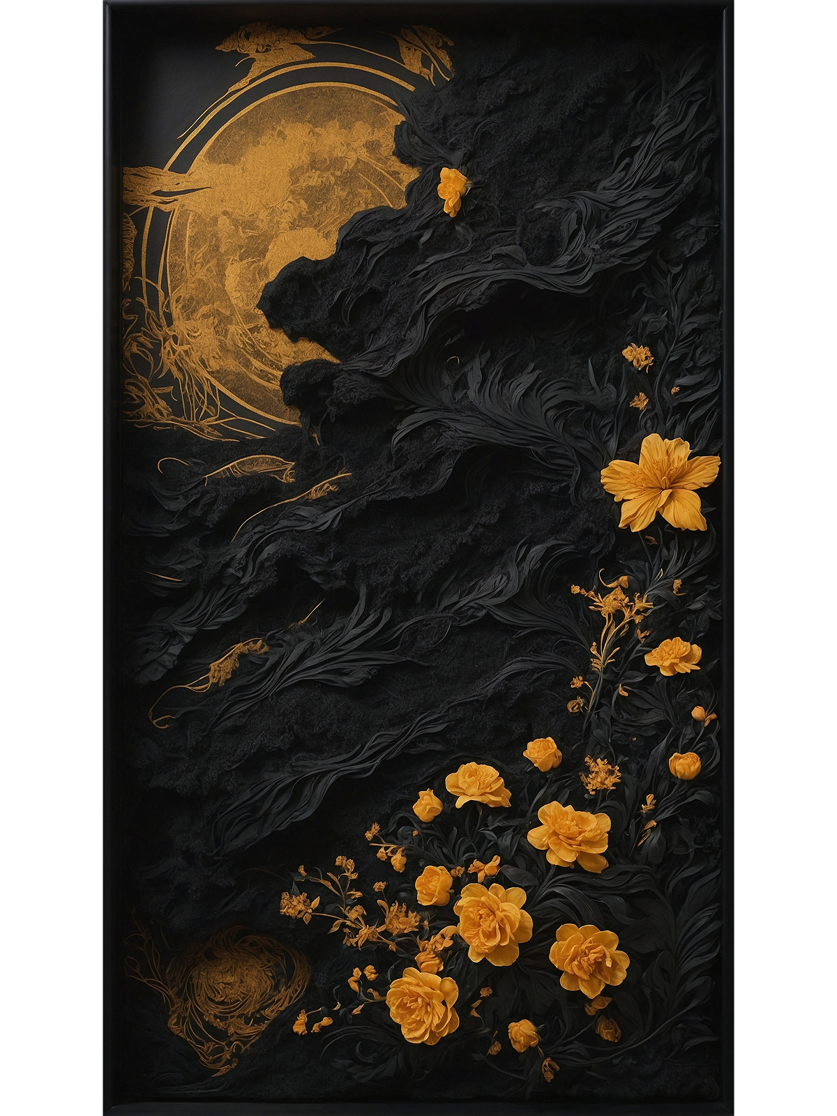 “Flores Douradas no Escuro” representa o auge do luxo dramático ao explorar a força do contraste entre luz e sombra. Este quadro abstrato floral utiliza preto e dourado de forma sofisticada, criando uma atmosfera envolvente. O fundo apresenta texturas que lembram ondas escuras ou tecido amassado, o que adiciona profundidade e mistério. As flores em tons de amarelo e ouro surgem dessa escuridão com grande intensidade. Como resultado, tornam-se o ponto focal da composição.