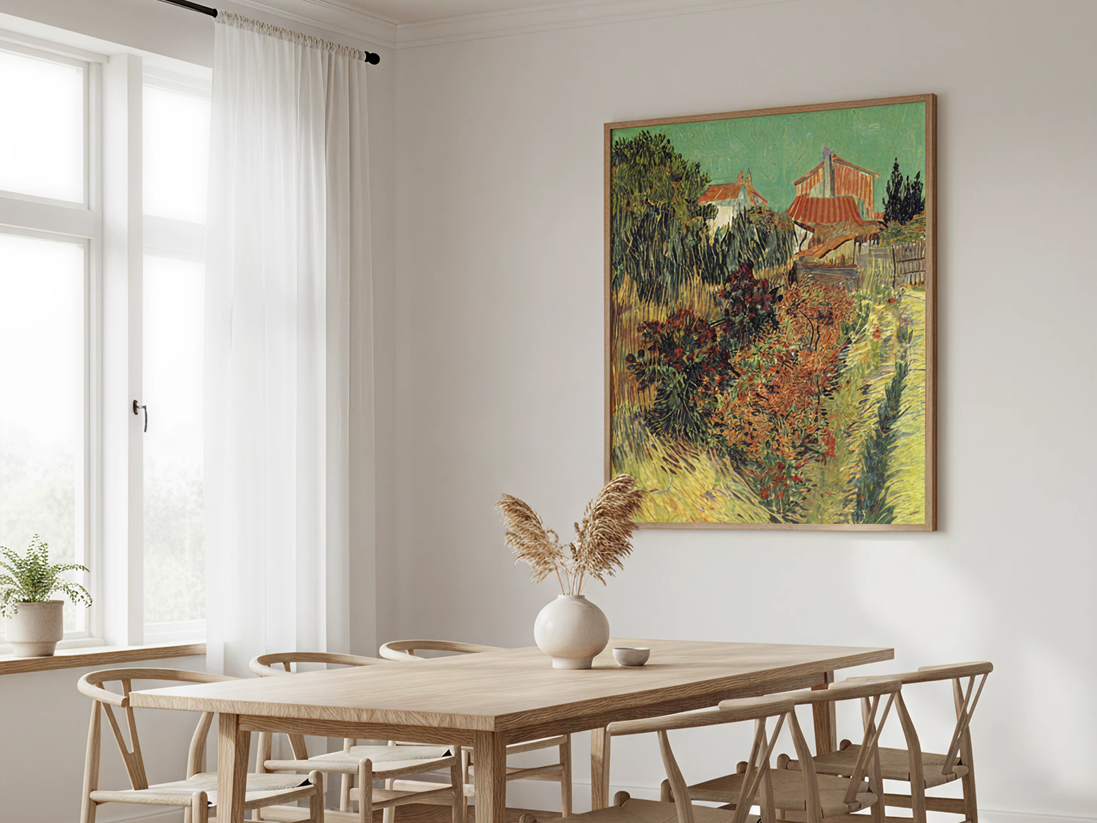 Garden behind a House, de agosto de 1888, é uma obra vibrante de Vincent van Gogh. Ele a pintou durante sua fase em Arles, no sul da França. A tela retrata um jardim exuberante com uma verdadeira explosão de vida e cor. O objetivo do artista era transmitir a vitalidade do ambiente sob o sol intenso do verão. Para isso, ele explorou a cor, a luz e a textura com grande paixão, fazendo a cena pulsar com energia.
