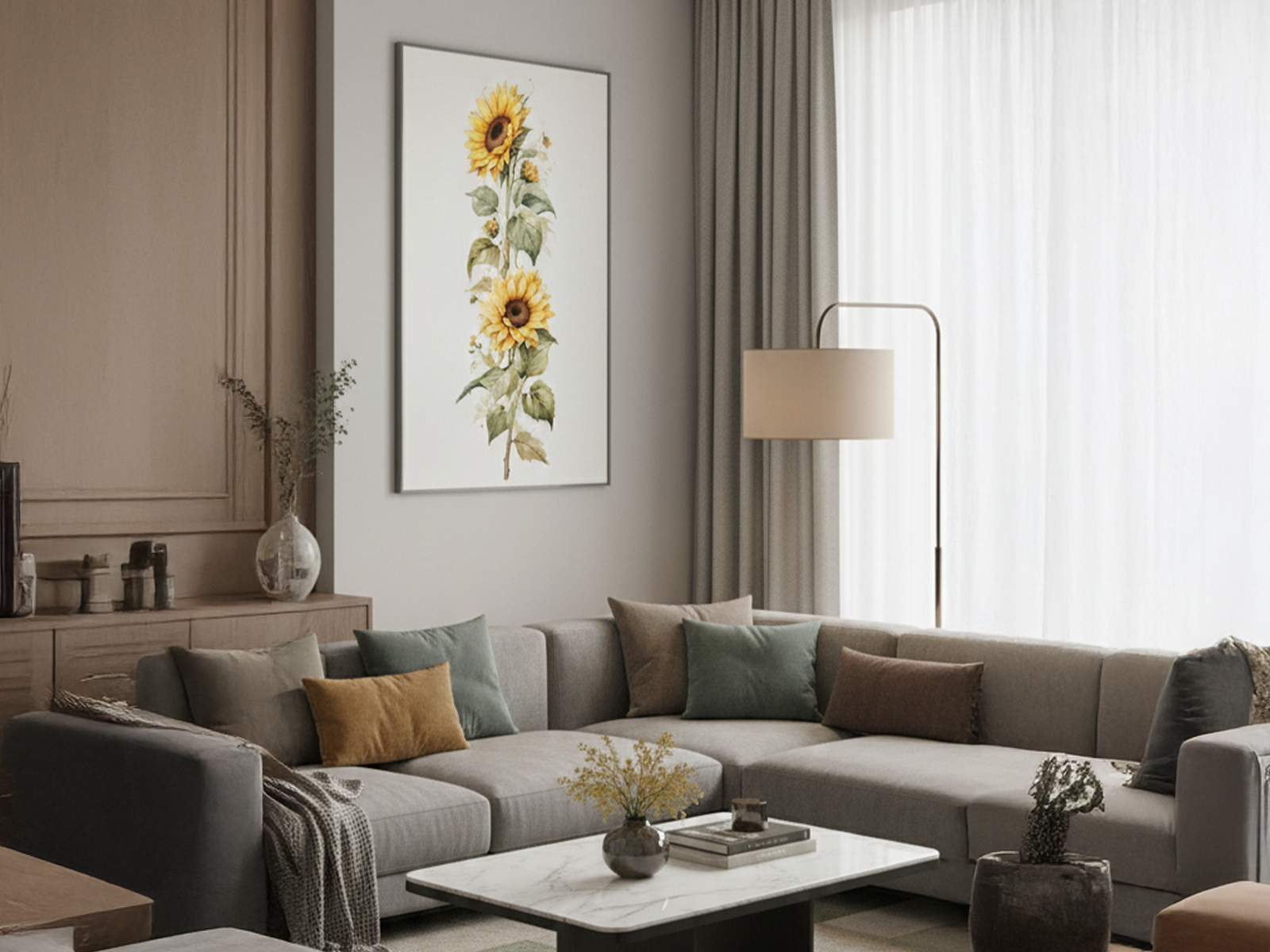 A composição revela o caule completo, incluindo os botões ainda fechados no topo. O fundo texturizado em bege-claro reforça o clima clássico e acolhedor. Além disso, os detalhes das sementes e nervuras são reproduzidos com precisão cuidadosa. “Girassol Botânico Vertical” combina muito bem com cozinhas, varandas gourmet e áreas iluminadas. Ele carrega a sensação de sol entrando pela casa.