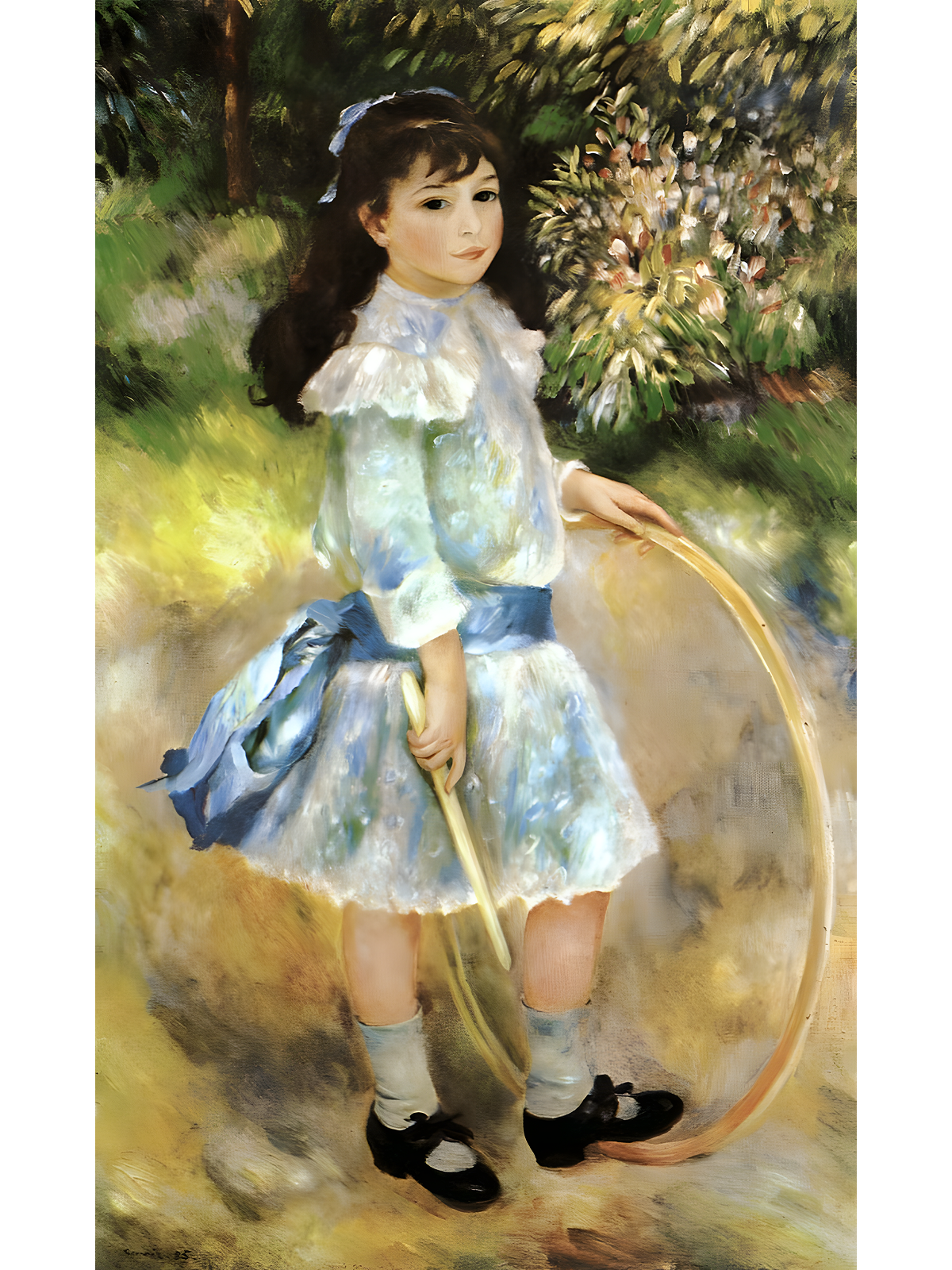 Girl with a Hoop, de 1885, é uma obra representativa de Pierre-Auguste Renoir. Ela pertence, sem dúvida, ao movimento Impressionista francês. Nesta tela, Renoir retrata uma jovem brincando com seu arco em um jardim. Seu objetivo principal é explorar a inocência, o movimento e a leveza infantil. Consequentemente, a pintura transmite uma imensa alegria de viver. Acima de tudo, a cena captura um momento de pura espontaneidade.