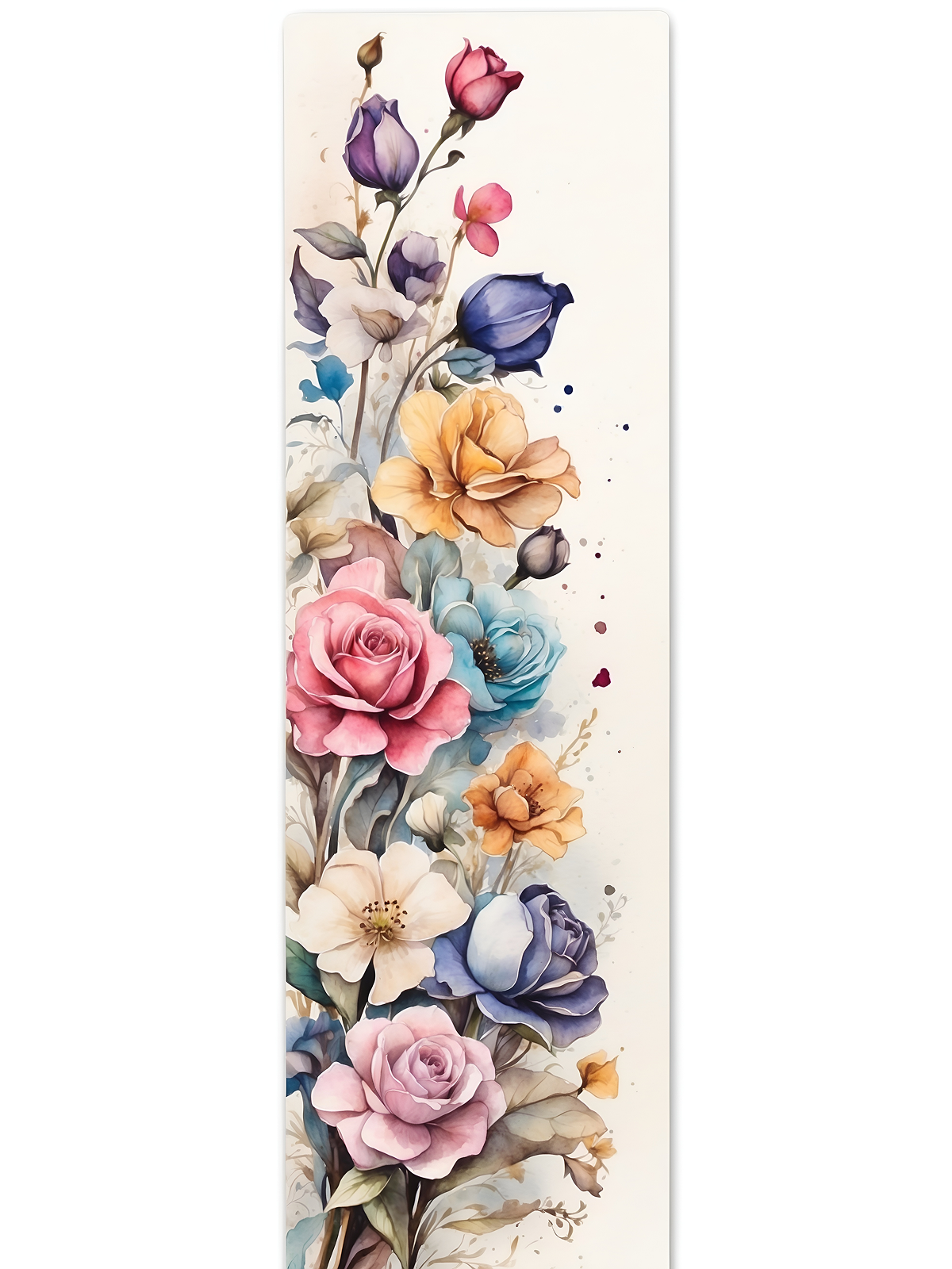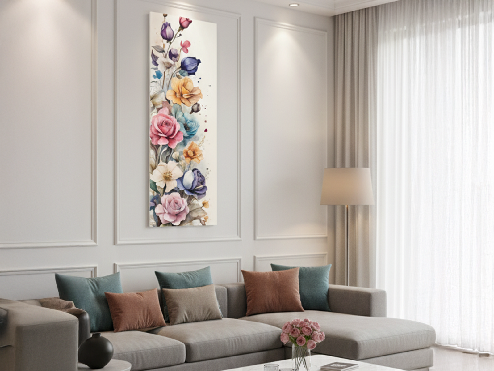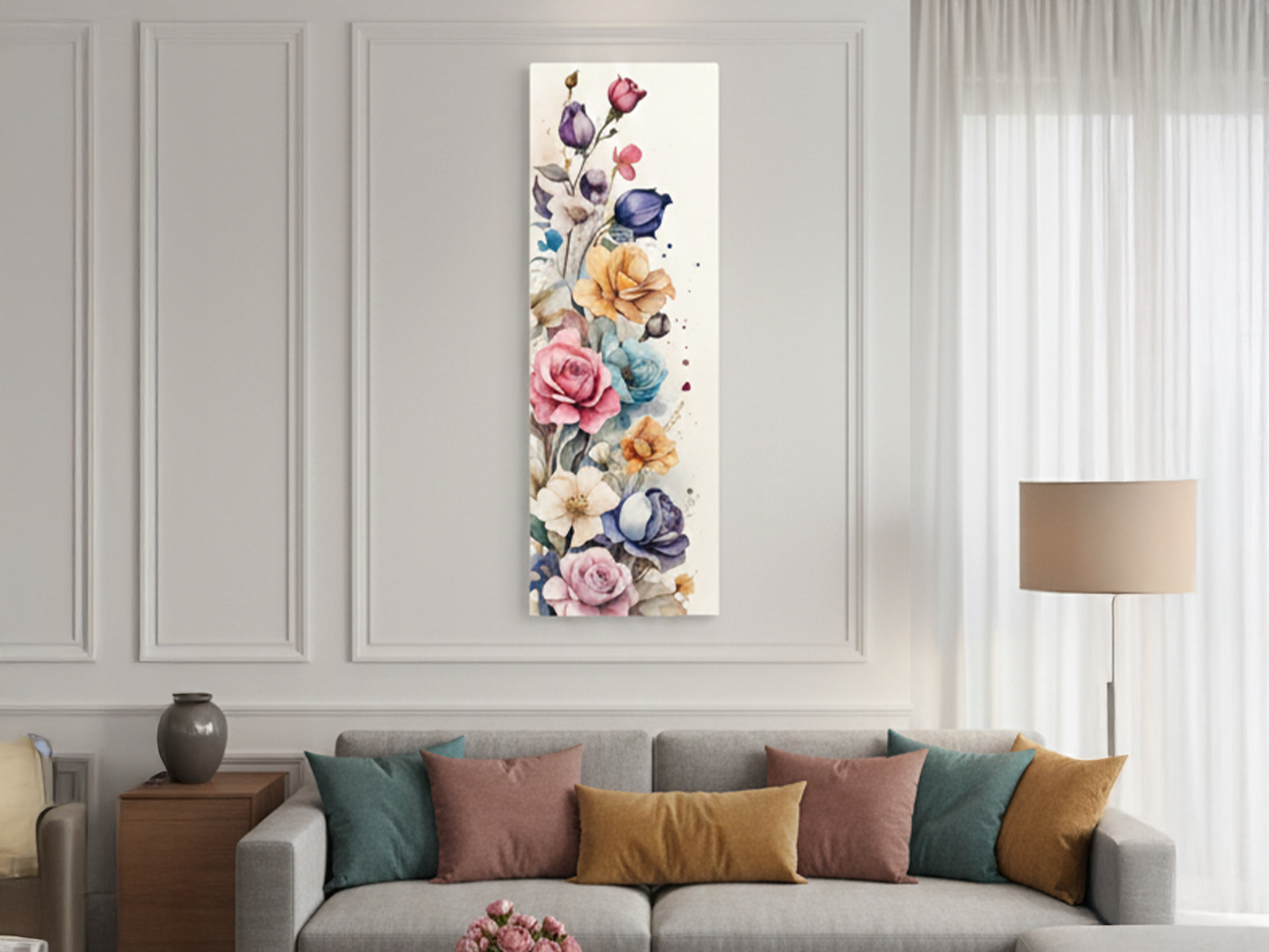A técnica de aquarela aparece em manchas leves e transparências delicadas. Esses efeitos adicionam movimento e suavidade. Além disso, o fundo claro realça o colorido vibrante das pétalas. “Jardim Vertical Aquarela” funciona muito bem em colunas, corredores ou paredes estreitas. O formato otimiza o espaço e se adapta facilmente a diferentes ambientes.