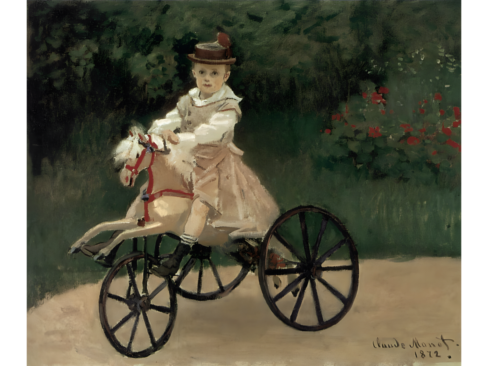 Jean Monet on His Mechanical Horse, de 1872, é uma obra de Claude Monet. Ela é, sem dúvida, uma de suas pinturas mais íntimas e pessoais. Nesta tela, o artista retrata seu filho, Jean, brincando tranquilamente no jardim. Seu objetivo principal é capturar a luz suave e a expressão concentrada da criança. Para isso, Monet utiliza pinceladas soltas e cores muito delicadas. Consequentemente, a pintura transmite uma enorme espontaneidade e leveza.