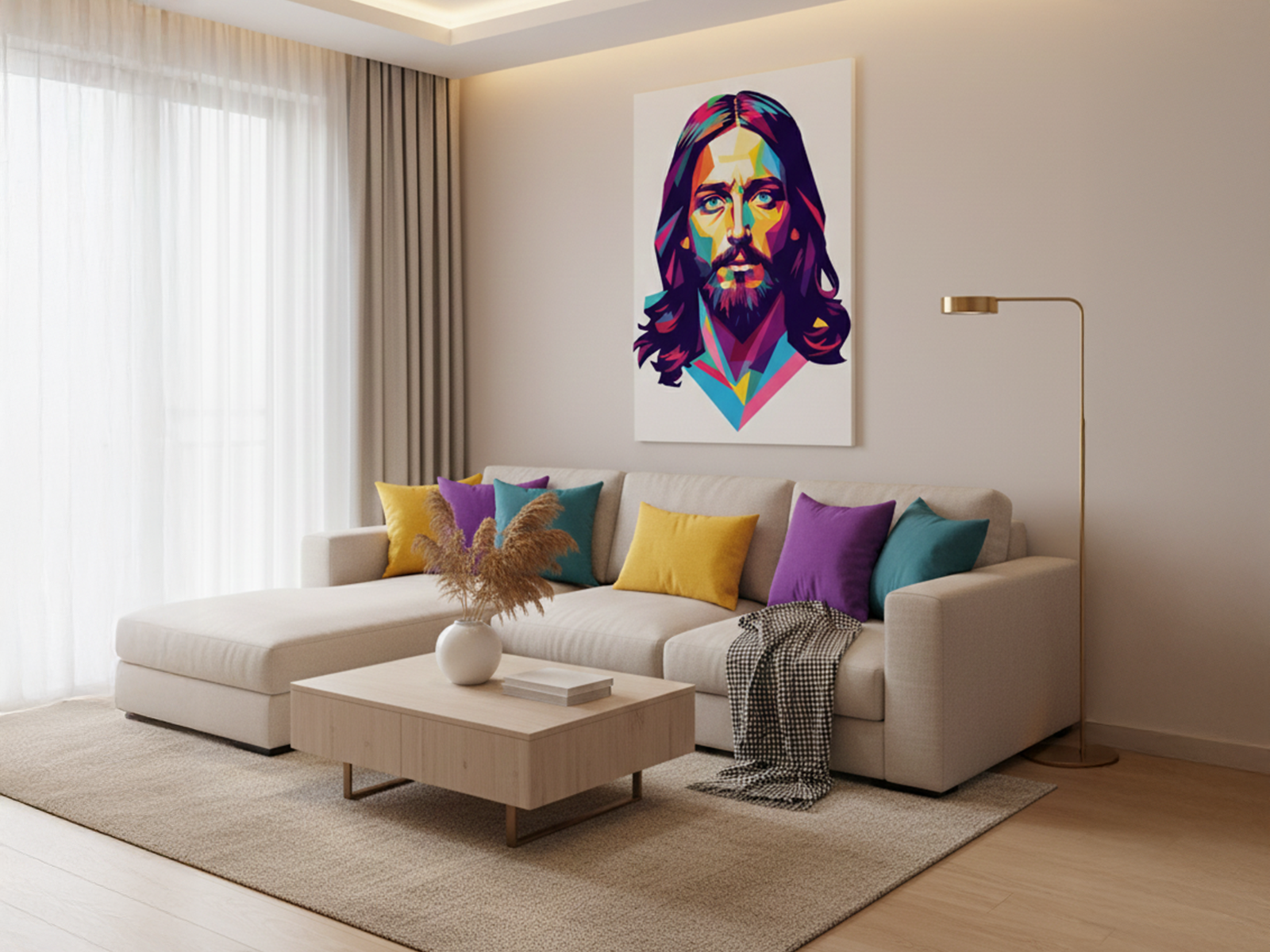 A simetria do rosto transmite sensação de equilíbrio e serenidade. As formas angulares produzem jogos de luz e sombra que enriquecem a profundidade da imagem. Além disso, o contraste entre o cabelo escuro e a pele facetada cria um efeito visual muito atraente. “Jesus Poligonal Colorido” se encaixa perfeitamente em decorações minimalistas que desejam apenas um toque marcante de cor. Sendo assim, o quadro funciona igualmente bem em escritórios, salas de estar ou ambientes criativos.