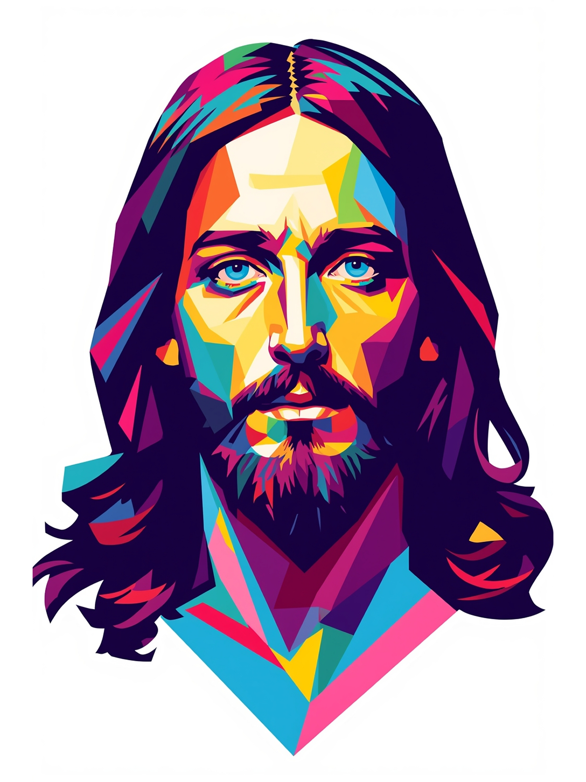 “Jesus Poligonal Colorido” representa a união entre fé e geometria. Este quadro moderno apresenta o rosto de Cristo construído por formas geométricas vibrantes no estilo low poly. Logo no início, o fundo branco e minimalista evidencia ainda mais as cores intensas da face. Observam-se tons de roxo, azul, amarelo e rosa se encaixando com precisão. Dessa forma, a obra assume um visual contemporâneo, quase tecnológico.