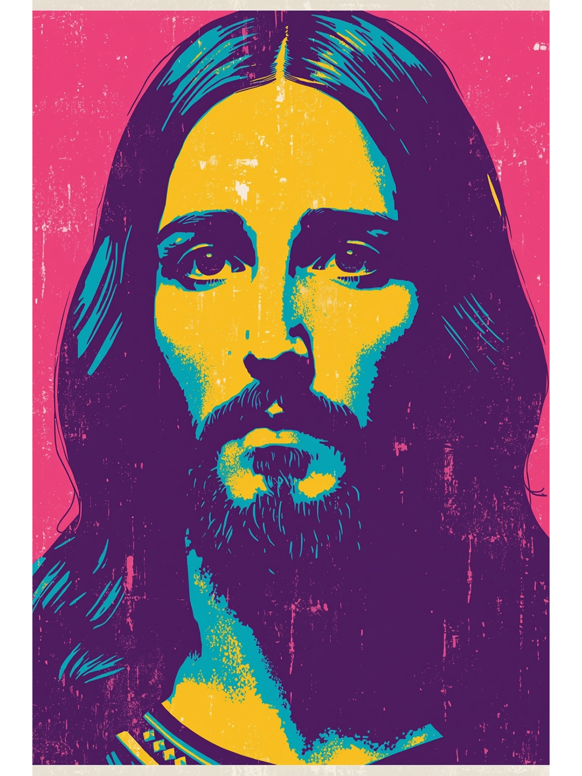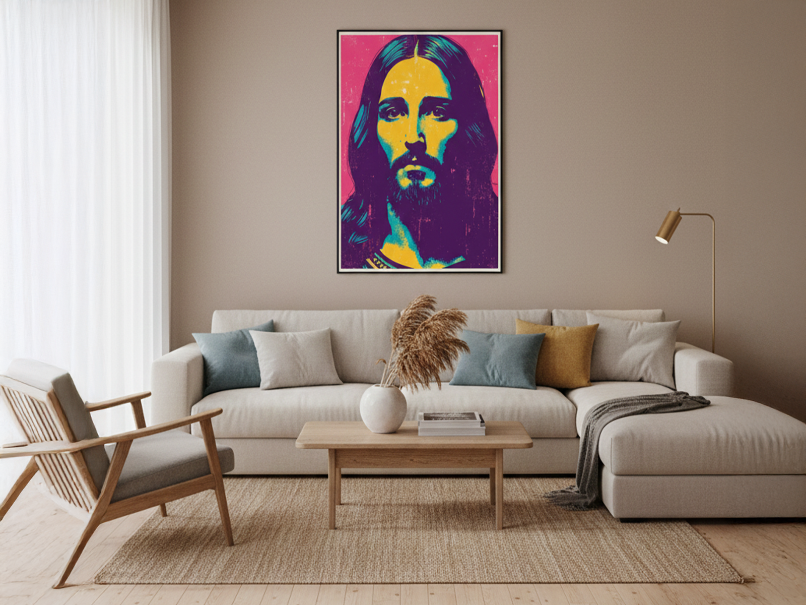 A textura desgastada lembra cartazes antigos colados em muros urbanos. Esse detalhe adiciona charme e autenticidade, como se a imagem tivesse atravessado décadas. Além disso, o olhar de Jesus transmite presença e força, mesmo em meio às cores ousadas. “Jesus Retro Pop” combina muito bem com ambientes que valorizam estilo, irreverência e liberdade criativa.