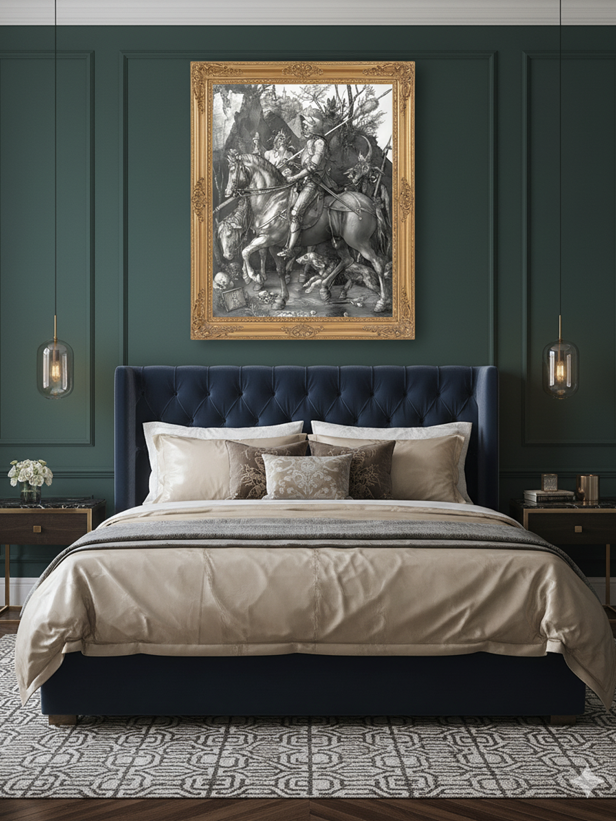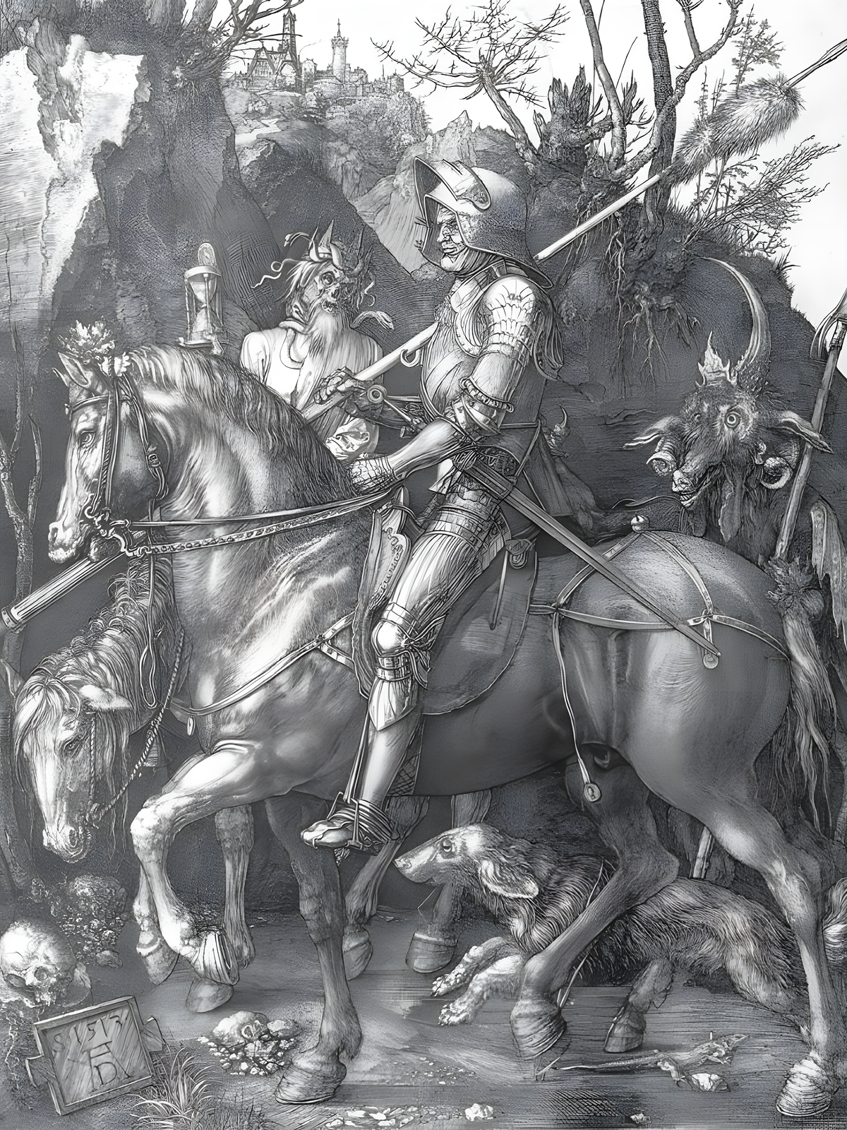 Knight, Death and the Devil, de 1513, é uma obra de Albrecht Dürer. Ela é, sem dúvida, uma das gravuras mais emblemáticas do Renascimento alemão. Nesta obra, o artista retrata um cavaleiro cristão avançando por um cenário sombrio. Seu objetivo principal é explorar a coragem, a moralidade e um profundo simbolismo. Para isso, Dürer cria uma cena densa e cheia de detalhes alegóricos. Consequentemente, a obra se torna uma meditação sobre a fé e a perseverança.