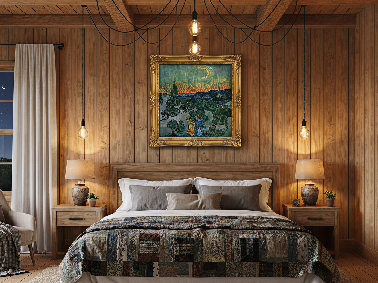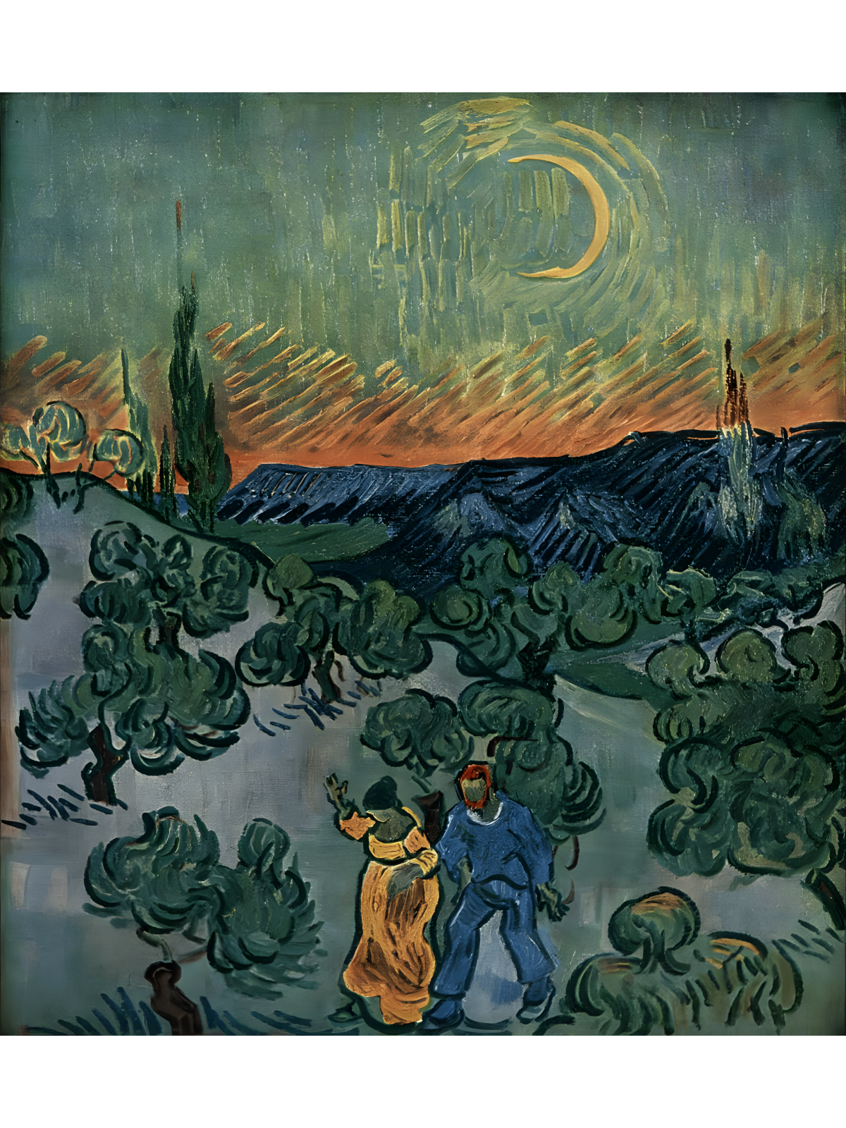 Landscape with Couple Walking and Crescent Moon, de 1890, é uma obra poética de Vincent van Gogh. Ele a pintou durante sua internação no asilo em Saint-Rémy. Nesta tela, o artista retrata um casal caminhando tranquilamente ao anoitecer. Seu objetivo principal é explorar a cor, a luz e a emoção de uma paisagem noturna. Para isso, Van Gogh utiliza uma paleta de cores profundamente simbólica. Consequentemente, a pintura transmite uma atmosfera de calma e introspecção.