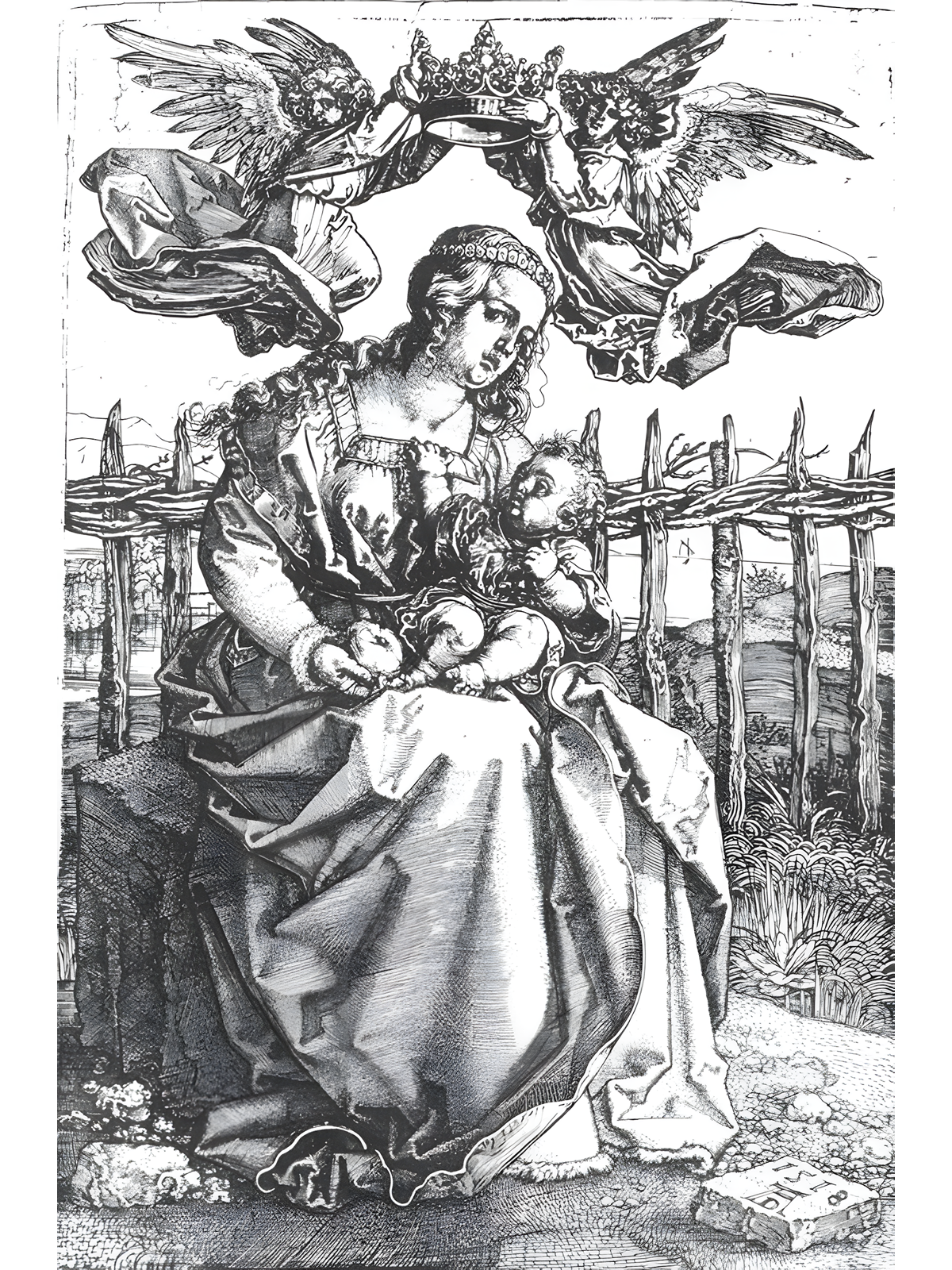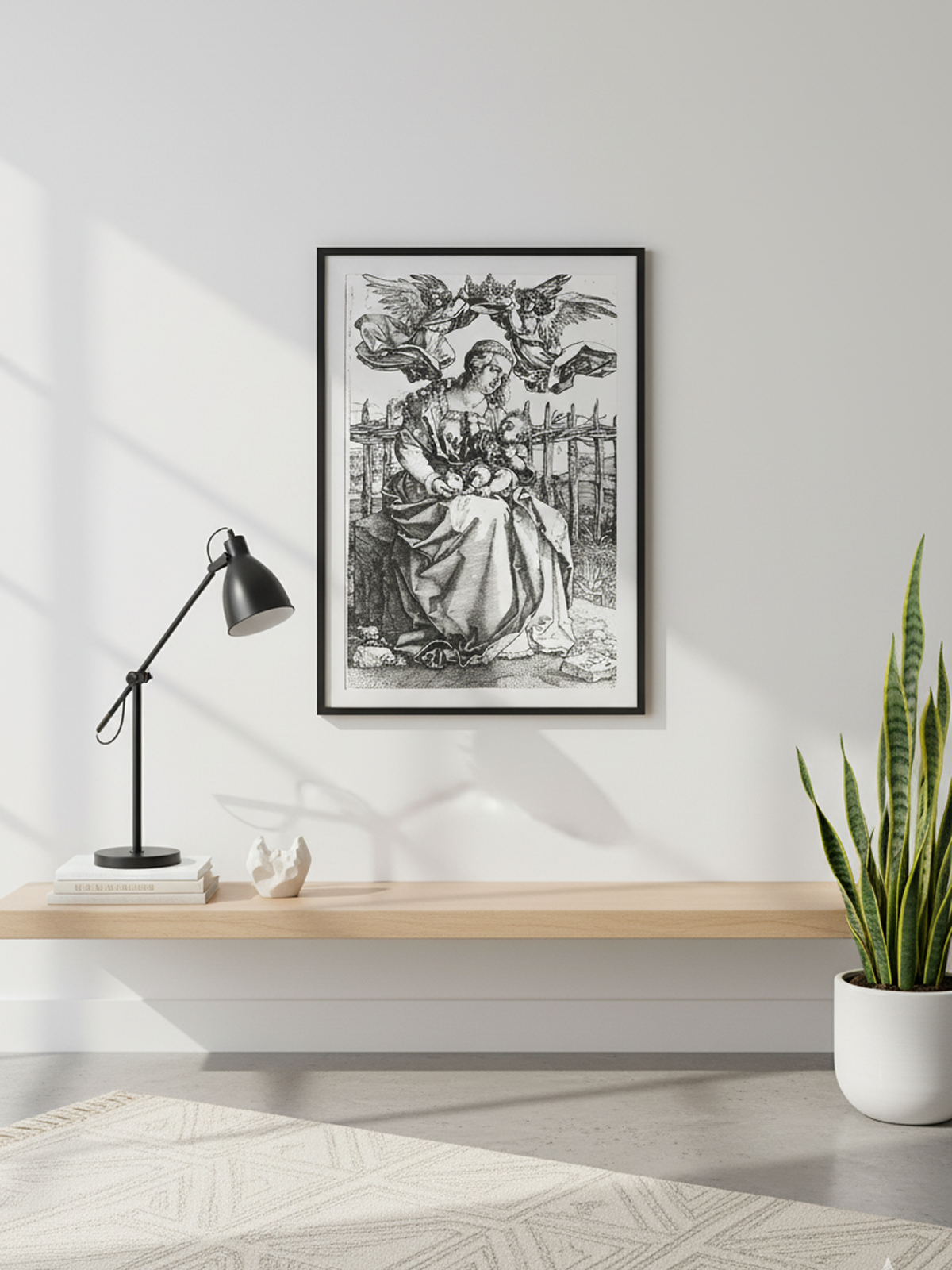 Madonna Crowned by Two Angels, de 1518, é uma obra de Albrecht Dürer. Ela é, sem dúvida, um exemplo emblemático do Renascimento alemão. Nesta gravura, o artista retrata a Virgem Maria sendo coroada por anjos. Seu objetivo principal é explorar a espiritualidade, a harmonia e o simbolismo. Para isso, Dürer utiliza uma técnica refinada e uma composição simétrica. Consequentemente, a obra transmite uma atmosfera de paz e devoção.