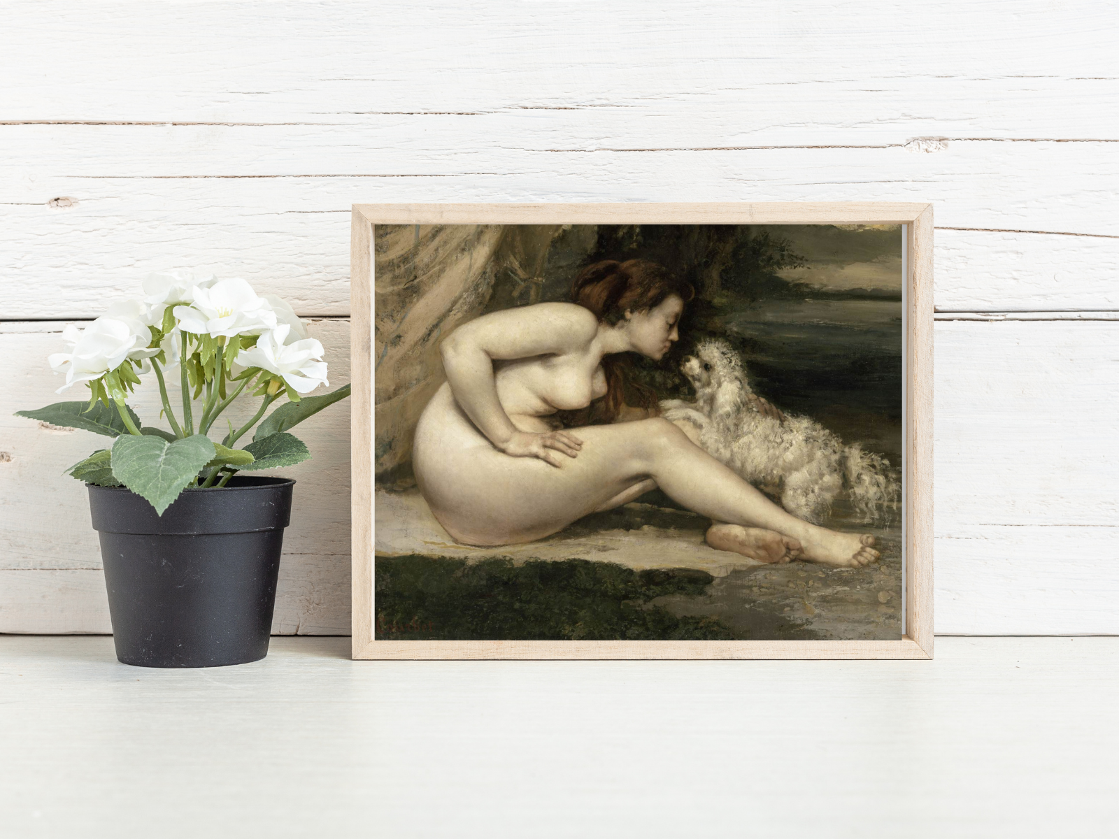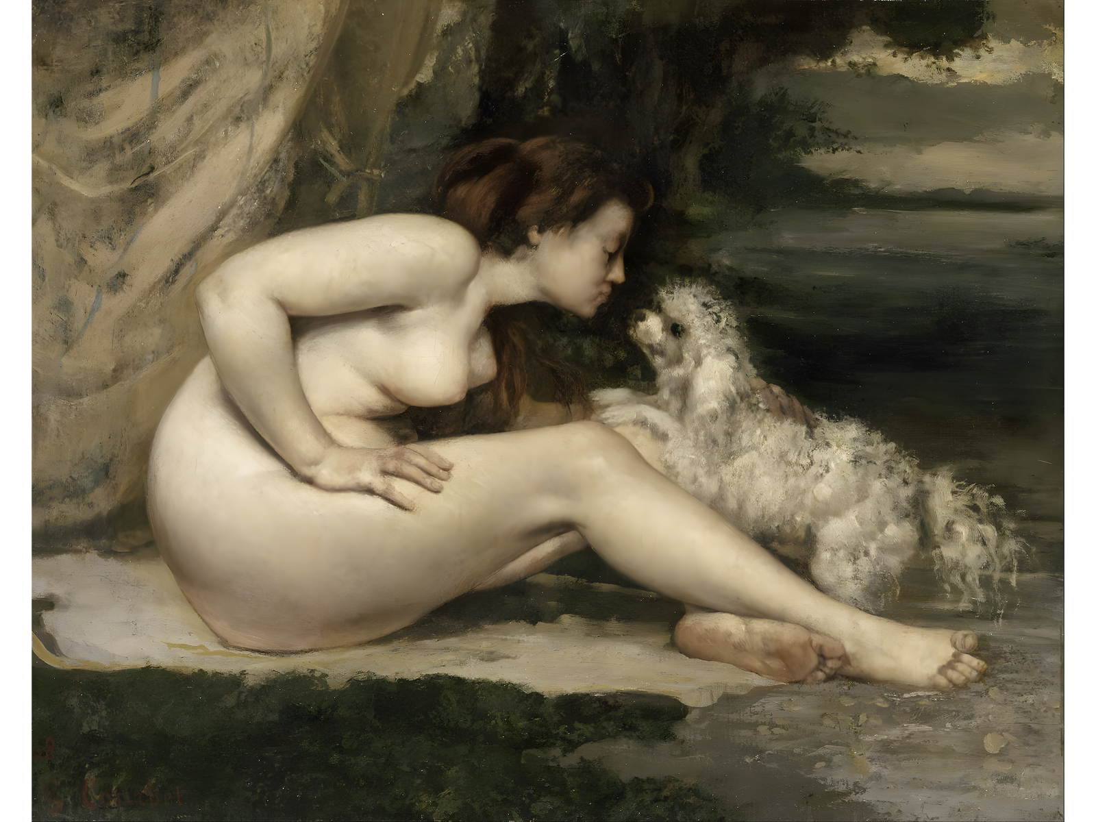 Nude Woman with Dog, de 1861, é uma obra icônica de Gustave Courbet. Ela é, sem dúvida, um marco do realismo francês do século XIX. Nesta tela, o artista retrata uma figura feminina nua ao lado de um cão. Seu objetivo principal é destacar a naturalidade e a intimidade do momento. Para isso, Courbet rompe com as idealizações clássicas da nudez. Consequentemente, ele enfatiza a realidade do corpo humano com honestidade.