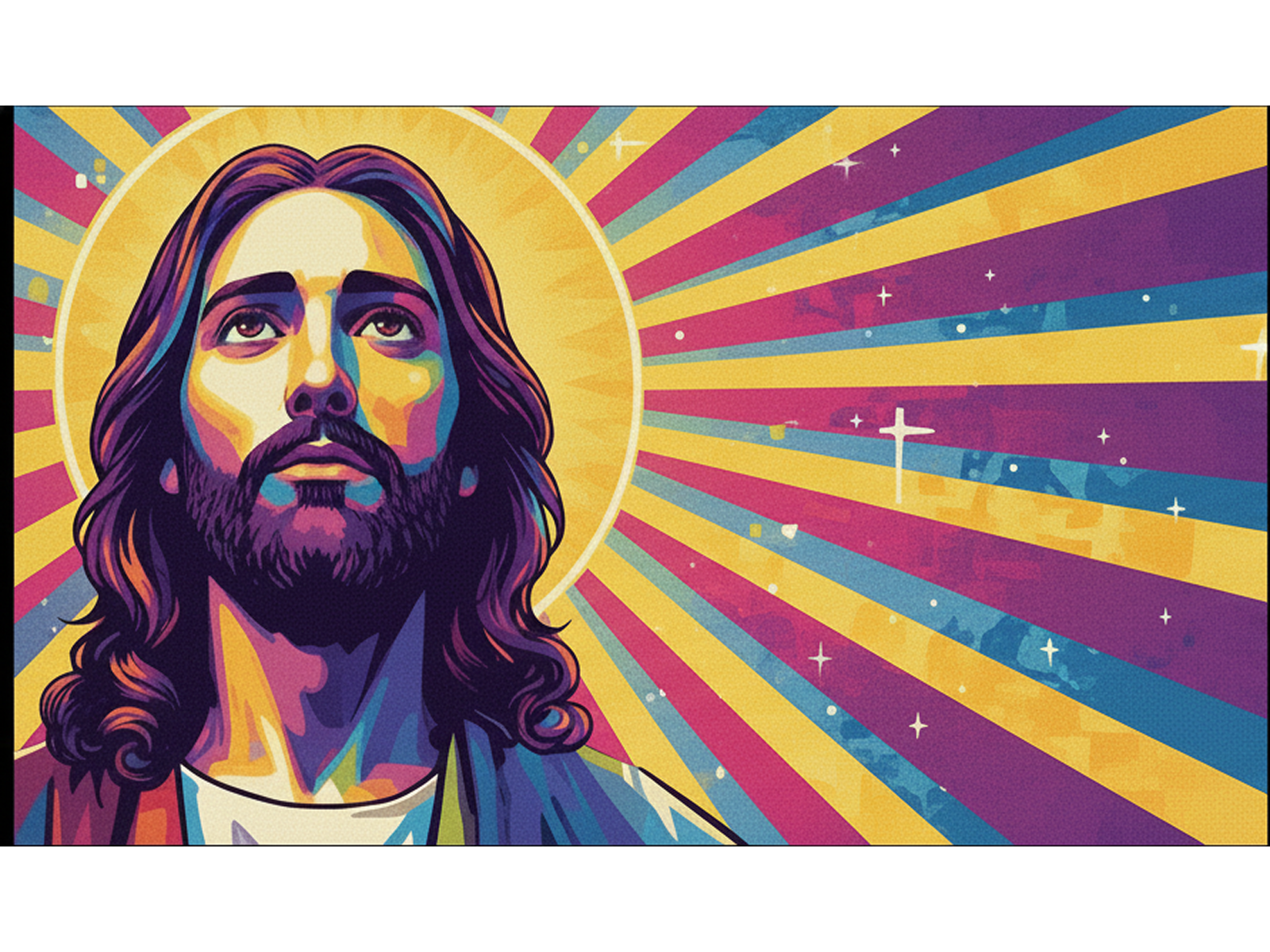 “Olhar de Esperança” apresenta uma obra gráfica e inspiradora que coloca o observador diante de uma interpretação moderna do sagrado. Desde o primeiro olhar, o quadro mostra o rosto de Jesus olhando para o céu, transmitindo busca, fé e direção. O estilo se mantém limpo, moderno e totalmente vetorial, o que cria uma estética atual e acessível. Primeiramente, notamos o fundo com raios coloridos em estilo retrô. Cores como amarelo, rosa e azul formam um efeito semelhante ao nascer do sol e, dessa forma, sugerem renovação, recomeço e otimismo para quem contempla a imagem.