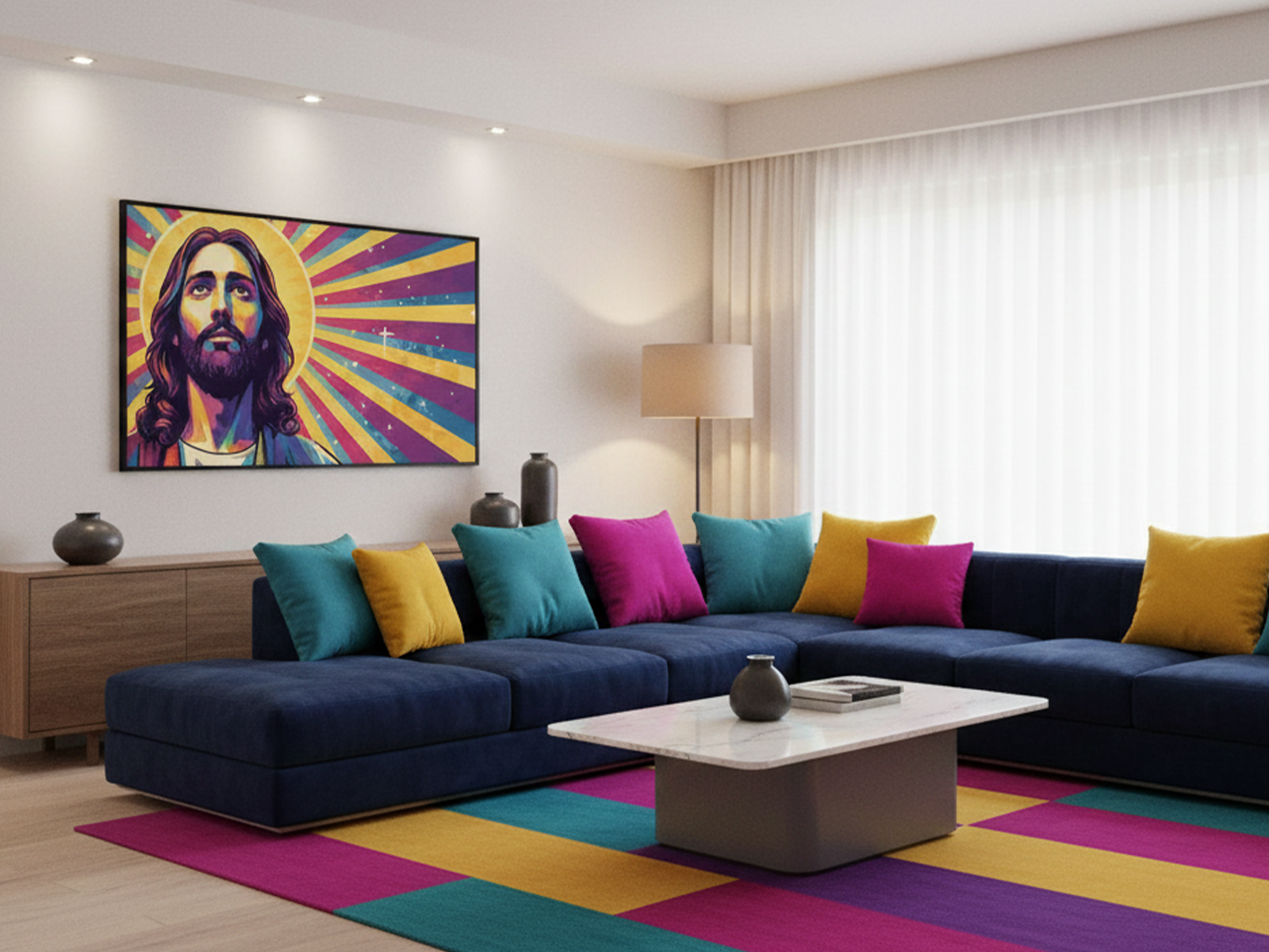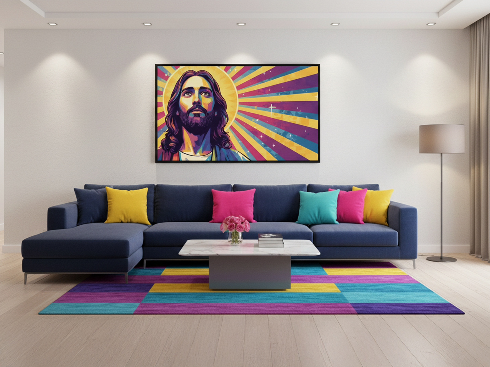 Este quadro decorativo aposta na estilização e se afasta do realismo clássico, aproximando a arte sacra de linguagens gráficas atuais. Assim, ele combina muito bem com móveis contemporâneos e ambientes modernos. A luz que irradia do fundo ilumina o espaço e cria um ponto focal relevante. Em suma, a obra une fé e design gráfico e traz uma mensagem positiva para o cotidiano.