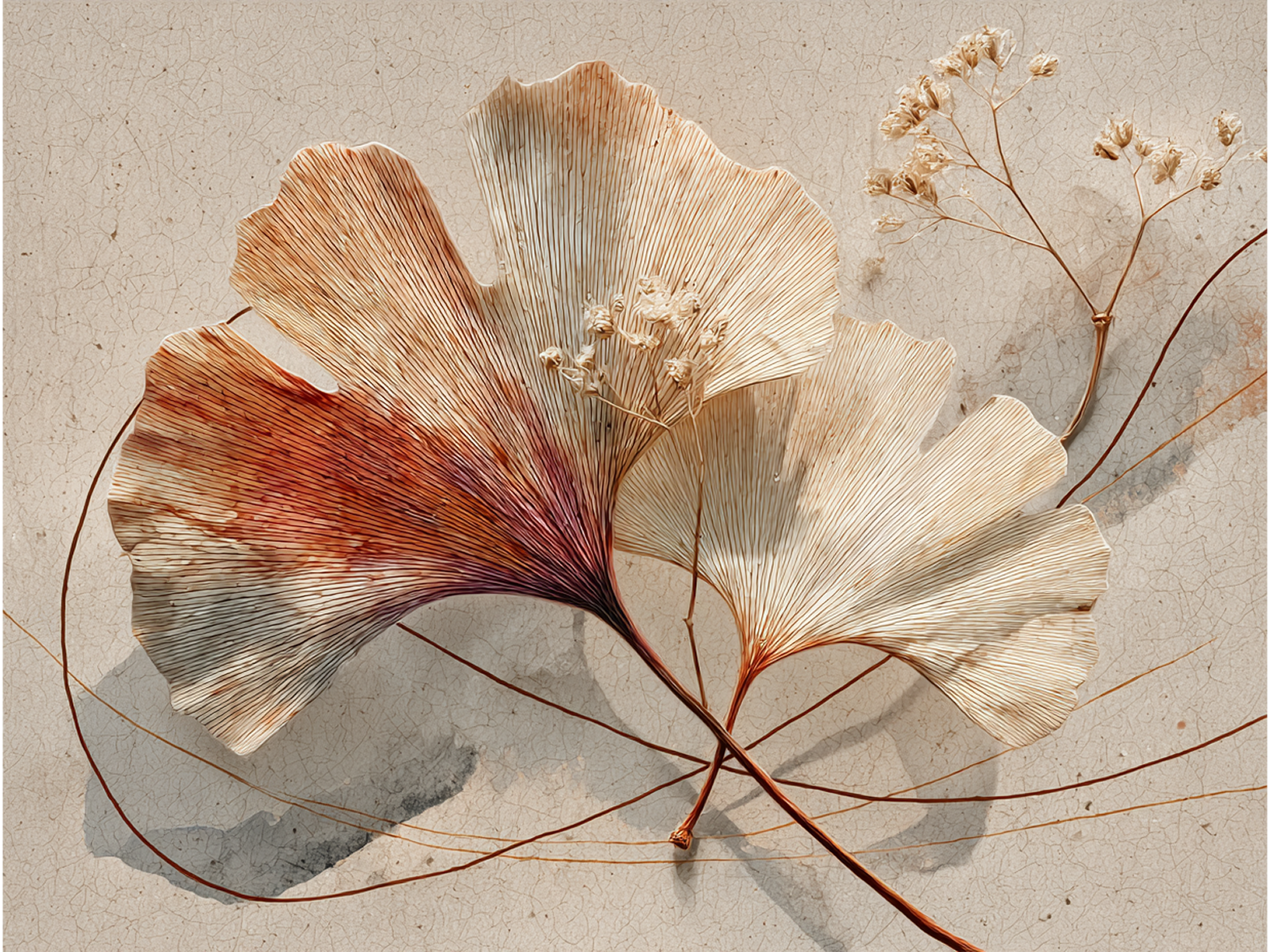 “Par de Folhas Ginkgo” valoriza os detalhes dessa planta tão particular. Este quadro botânico apresenta duas grandes folhas de Ginkgo cruzadas, formando uma composição delicada e equilibrada. Para começar, a riqueza de texturas presentes nas folhas se torna o grande destaque. Percebemos as estrias naturais bem definidas e uma paleta que combina tons de bege, vinho e leve saturação terrosa. O fundo claro exibe rachaduras suaves, lembrando a superfície envelhecida de uma parede antiga.