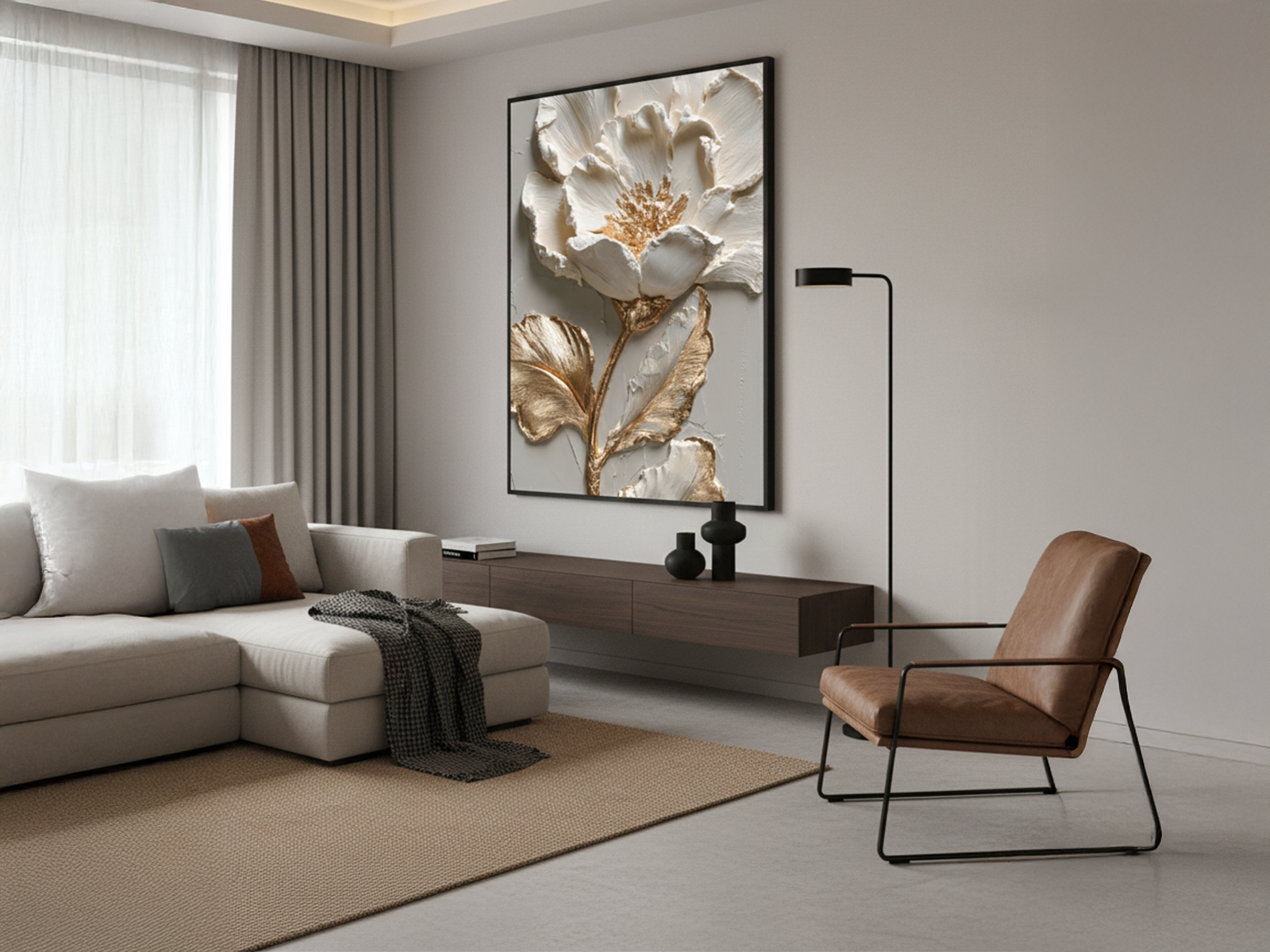 Além disso, a criação funciona quase como uma escultura aplicada à parede, graças ao relevo acentuado. O quadro “Peônia Branca em Relevo” reage à luz de forma dinâmica, variando conforme o ângulo de observação. Em resumo, trata-se de uma opção artística ideal para quem aprecia texturas ricas. A arte celebra a delicadeza da natureza com um toque de esplendor contemporâneo. Sem dúvida, ela se tornará o ponto focal de qualquer ambiente onde for exposta.