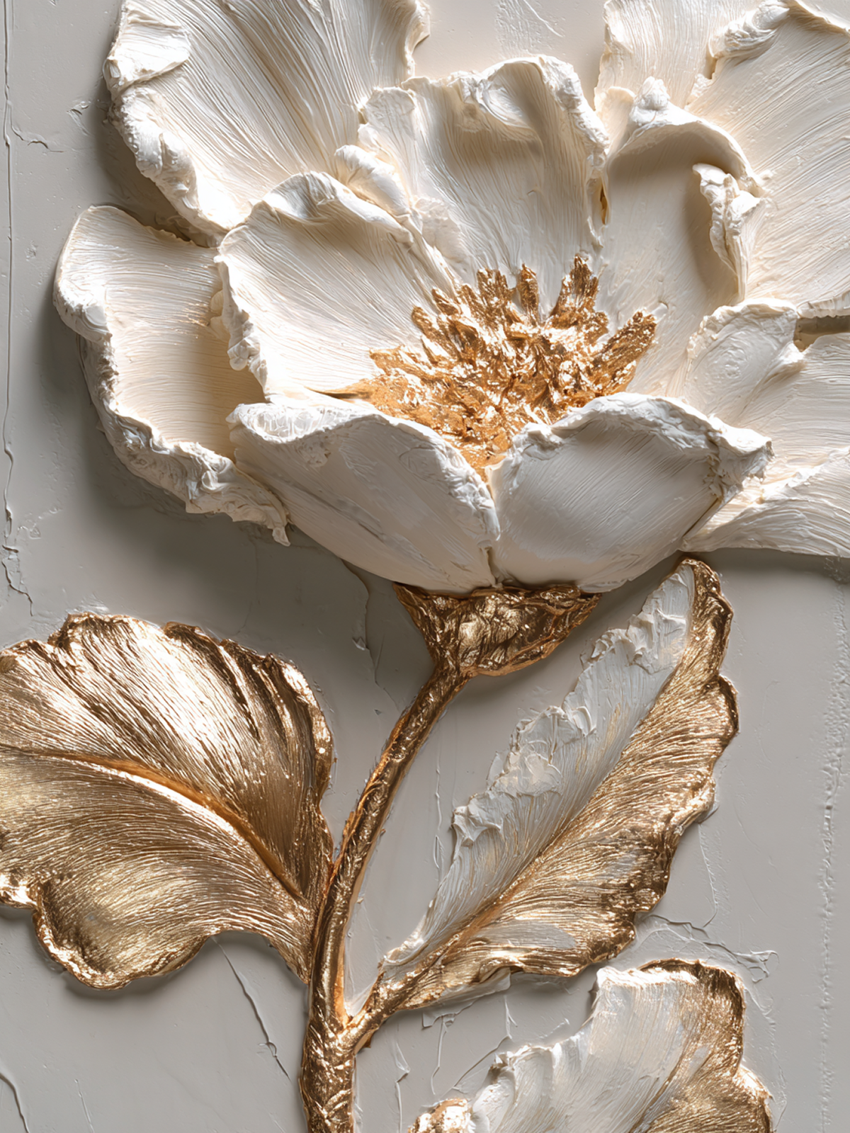 “Peônia Branca em Relevo” é uma obra de impacto tátil e visual. Este quadro floral evidencia uma grande flor branca com textura marcante e envolvente. Logo no início, a técnica simula uma pintura a óleo de espessura grossa (impasto) ou até mesmo gesso modelado. As pétalas exibem sulcos profundos que geram sombras naturais e muito realistas. O miolo dourado, trabalhado com textura metálica, acrescenta brilho e intensidade à composição.