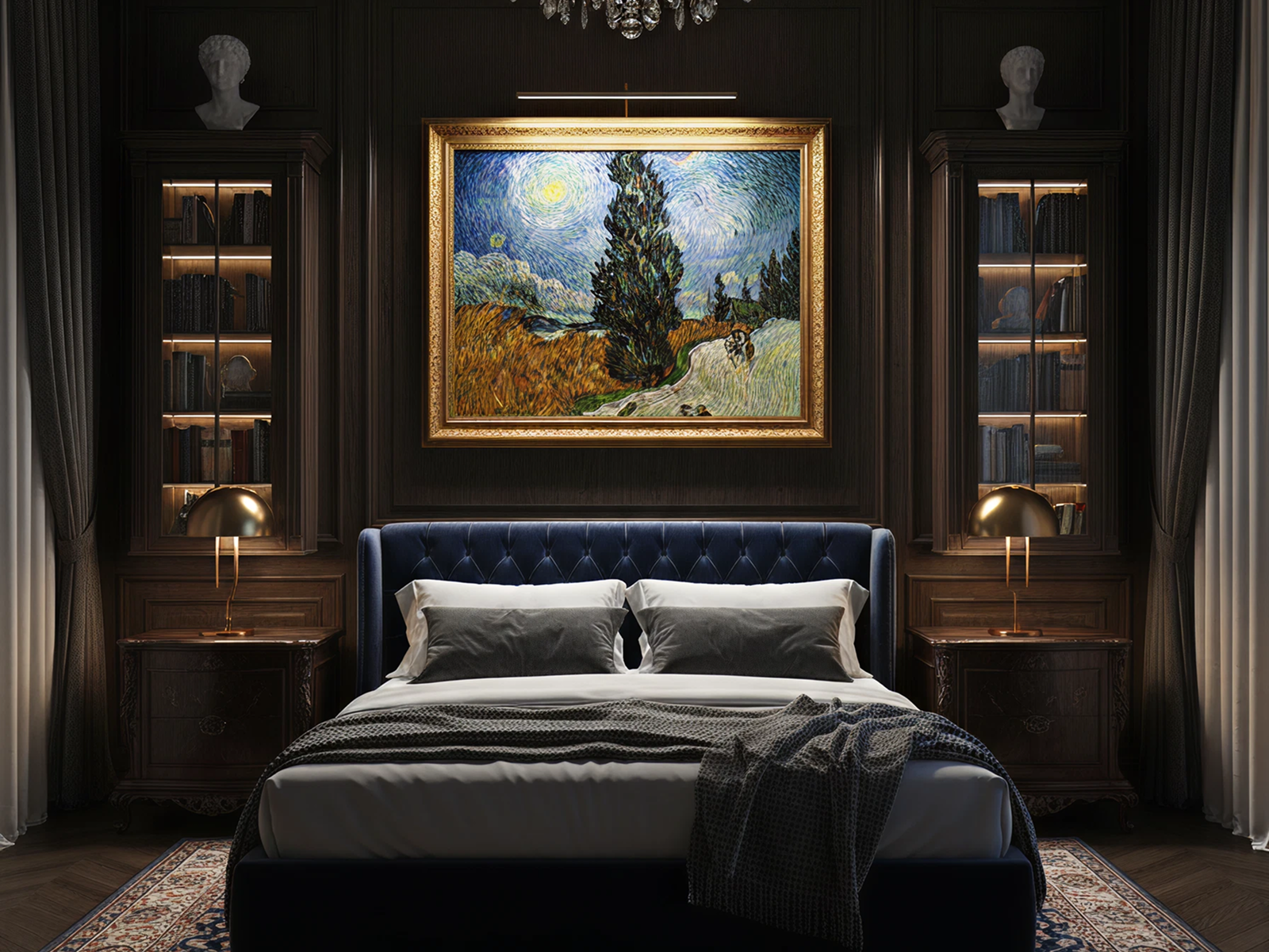 O artista utiliza a técnica de óleo sobre tela com pinceladas dinâmicas. Tons de azul profundo, verde e ocre se combinam de forma dramática. Além disso, a estrada conduz o olhar do espectador para o horizonte. O cipreste, por sua vez, eleva a composição verticalmente. Dessa forma, ele simboliza a conexão entre a vida e a morte. A estrela solitária, por fim, adiciona um simbolismo místico à cena.