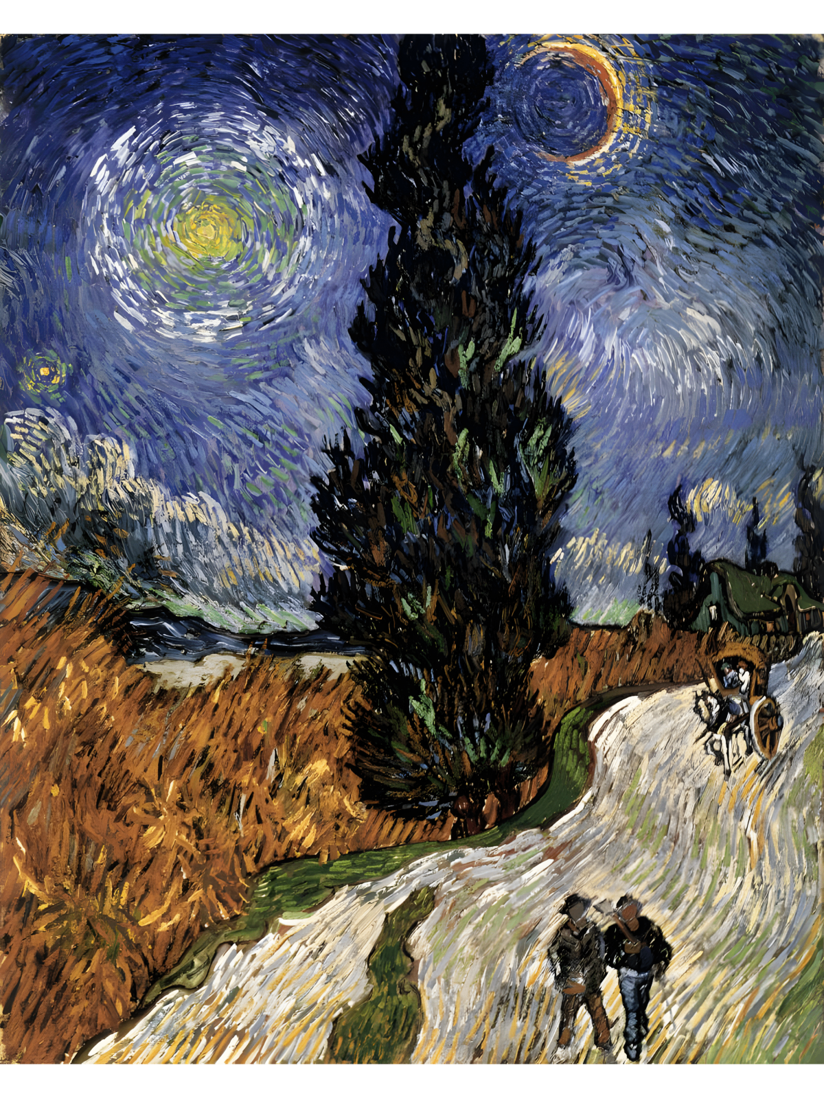 Road with Cypress and a Star, de 1890, é uma obra de Vincent van Gogh. Ela foi pintada em seus últimos meses de vida, em Auvers-sur-Oise. Nesta tela, o artista retrata uma estrada rural sob um céu noturno. Seu objetivo principal é explorar a cor, a perspectiva e a emoção. Para isso, Van Gogh projeta seus sentimentos na paisagem. Consequentemente, a obra transmite uma energia espiritual e intensa.