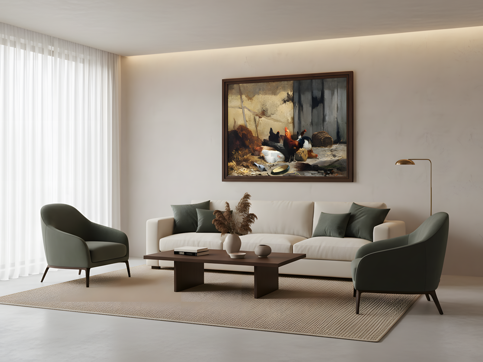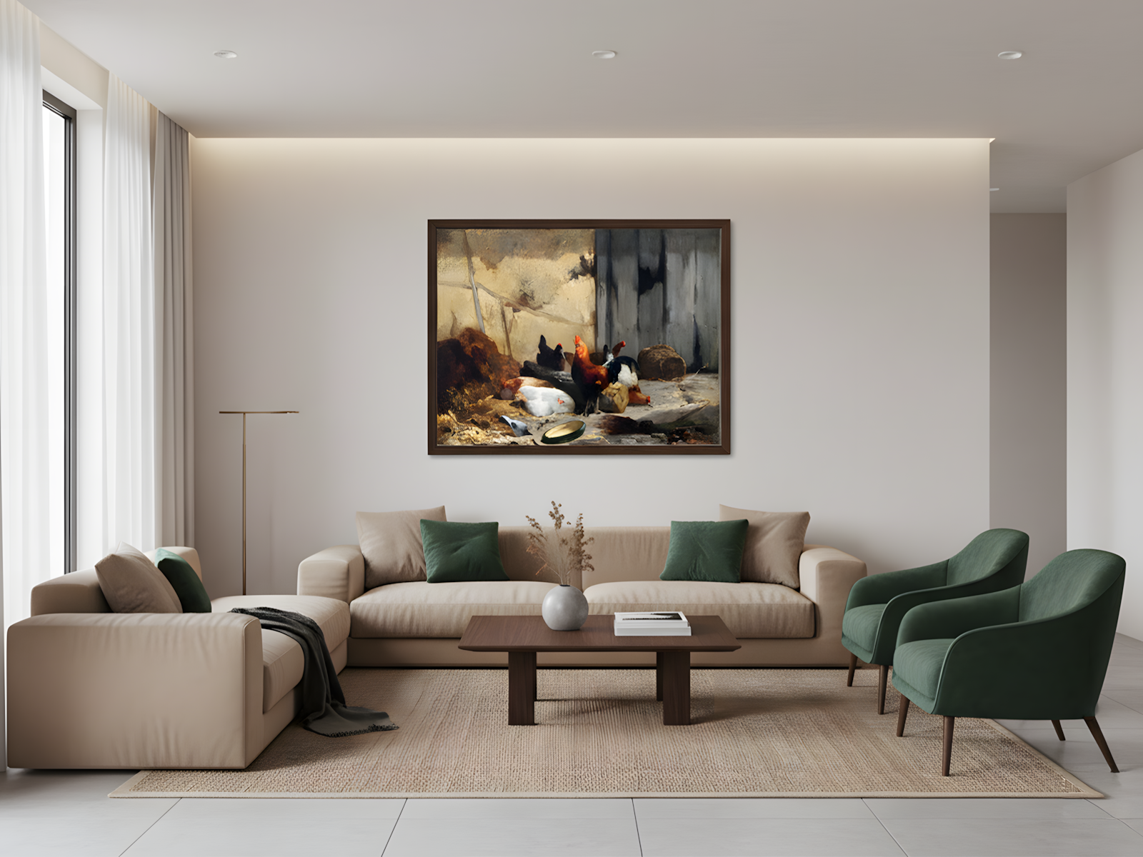 Rooster and Hens, de 1859, é uma obra de Charles Émile Jacque. Ela é, sem dúvida, representativa da pintura realista francesa do século XIX. Nesta tela, o artista retrata um galo e galinhas em uma cena campestre. Seu objetivo principal é explorar os detalhes, as cores e as texturas dos animais. Para isso, Jacque aplica sua técnica com grande precisão e observação. Consequentemente, a obra transmite uma atmosfera de naturalidade.