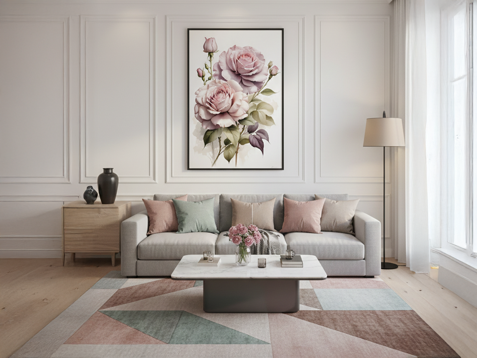 A luz difusa envolve as flores e acentua cada curva das pétalas. Botões fechados surgem ao redor e reforçam a sensação de vida contínua. Além disso, folhas verdes equilibram a composição e ampliam o contraste cromático. O arranjo se torna completo e muito harmonioso. “Rosas Clássicas” combina com ambientes que desejam serenidade e beleza constante. O quadro funciona muito bem em quartos delicados, salas com inspiração provençal ou espaços que valorizam cores claras.