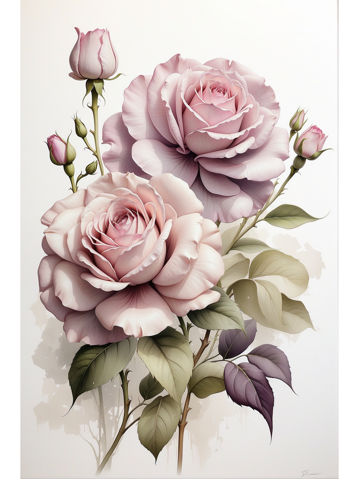 “Rosas Clássicas” representa o romance em sua forma mais pura. Este quadro floral revela rosas abertas em detalhes cuidadosos e muito delicados. As pétalas surgem em tons suaves de rosa-bebê e lilás, o que cria um perfume visual imediato. A estética lembra pinturas botânicas tradicionais que usam aquarela translúcida. Portanto, a imagem transmite uma suavidade encantadora desde o primeiro olhar.