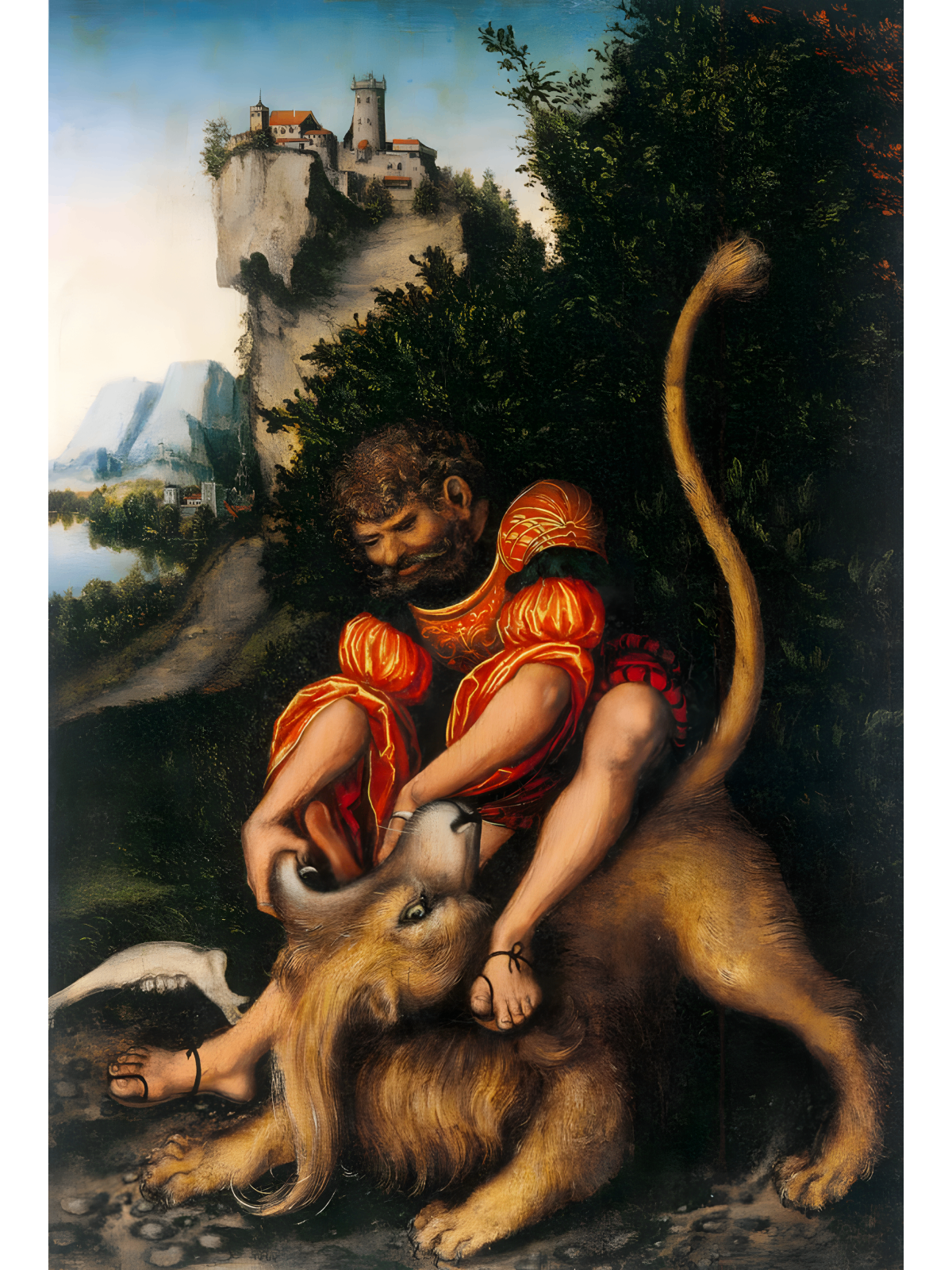Samson Slaying the Lion, de 1528, é uma obra de Lucas Cranach. Ela é, sem dúvida, representativa do Renascimento alemão. Nesta tela, o artista retrata Sansão no momento em que derrota o leão. Seu objetivo principal é explorar a força, a coragem e o heroísmo bíblico. Para isso, Cranach utiliza uma composição cheia de energia e movimento. Consequentemente, a obra transmite um forte impacto dramático.