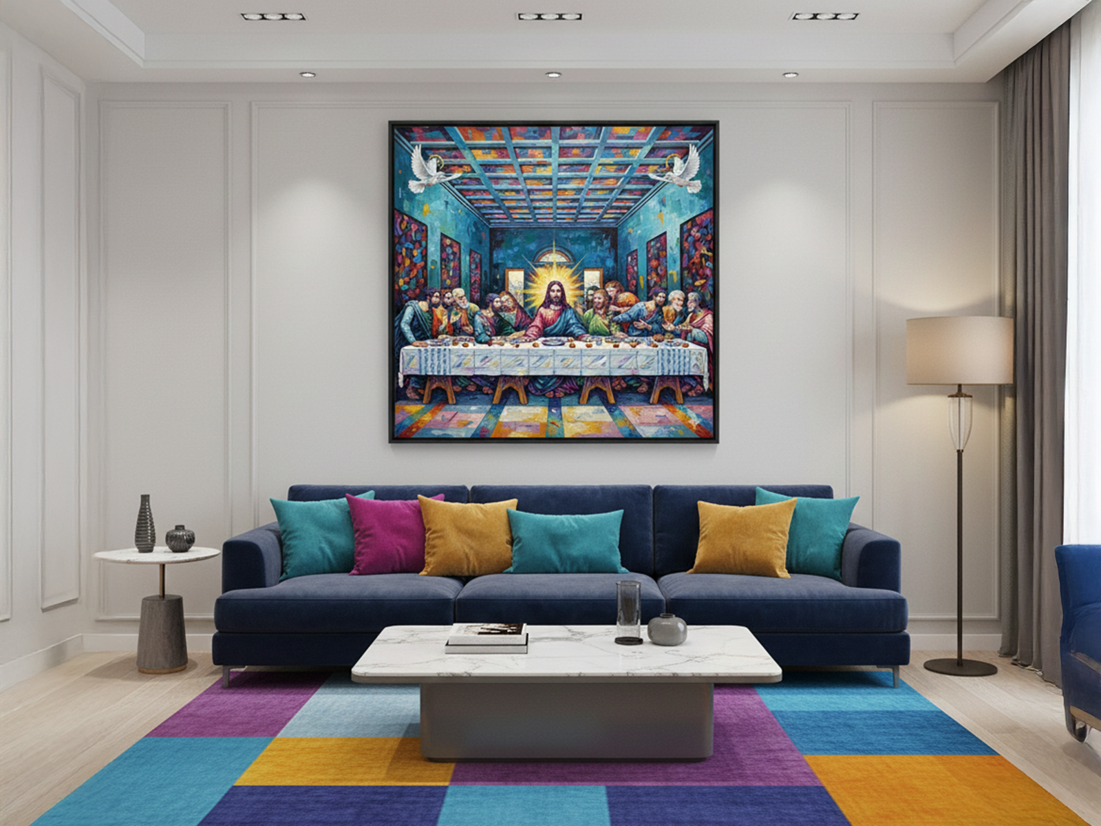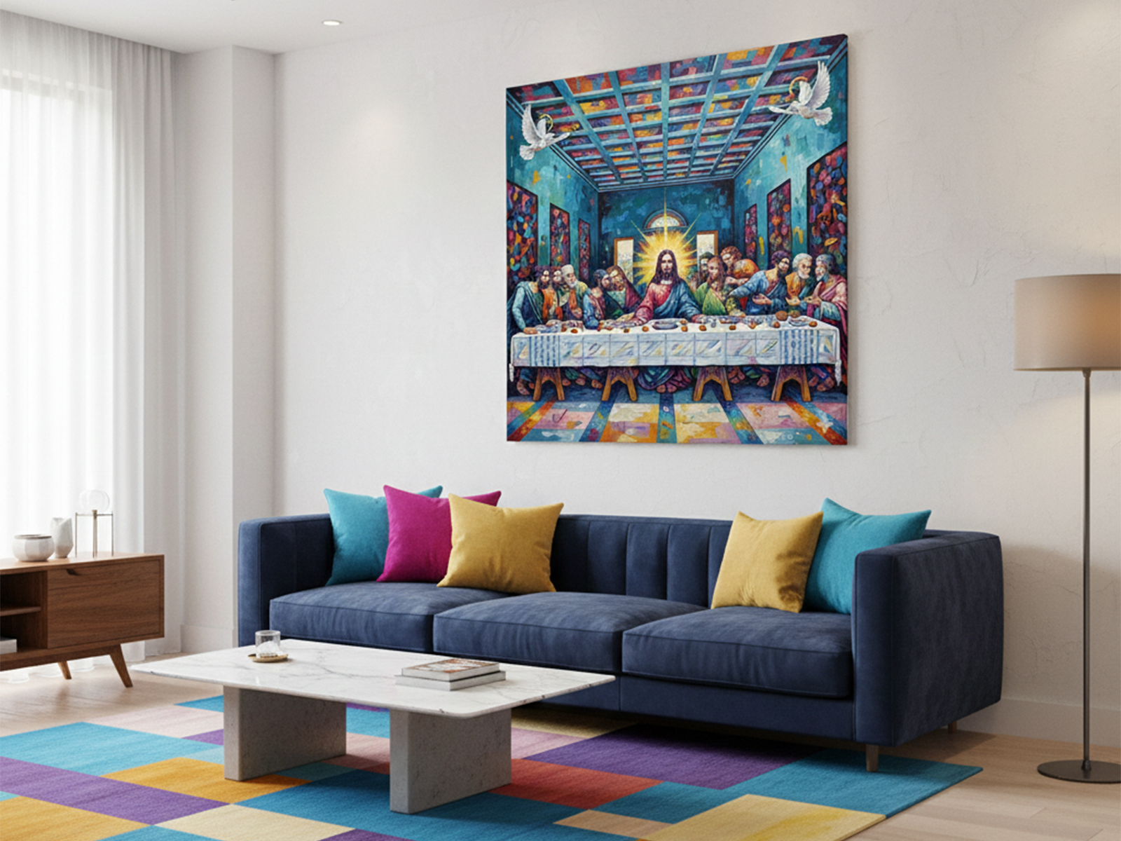“Santa Ceia Mosaico Azul” oferece uma visão única e contemporânea do momento sagrado, aproximando o observador de uma releitura moderna e cheia de significado. Este quadro religioso utiliza uma paleta predominante de tons azuis e frios, o que cria uma atmosfera serena e contemplativa. A cena acontece em uma sala com perspectiva profunda e, dessa forma, conduz o olhar para o centro da composição. Além disso, a técnica lembra um mosaico complexo ou até mesmo uma pintura cubista, já que pequenos blocos de cor constroem as figuras, os rostos e o cenário. Portanto, a imagem apresenta uma textura visual rica, detalhada e intrigante.