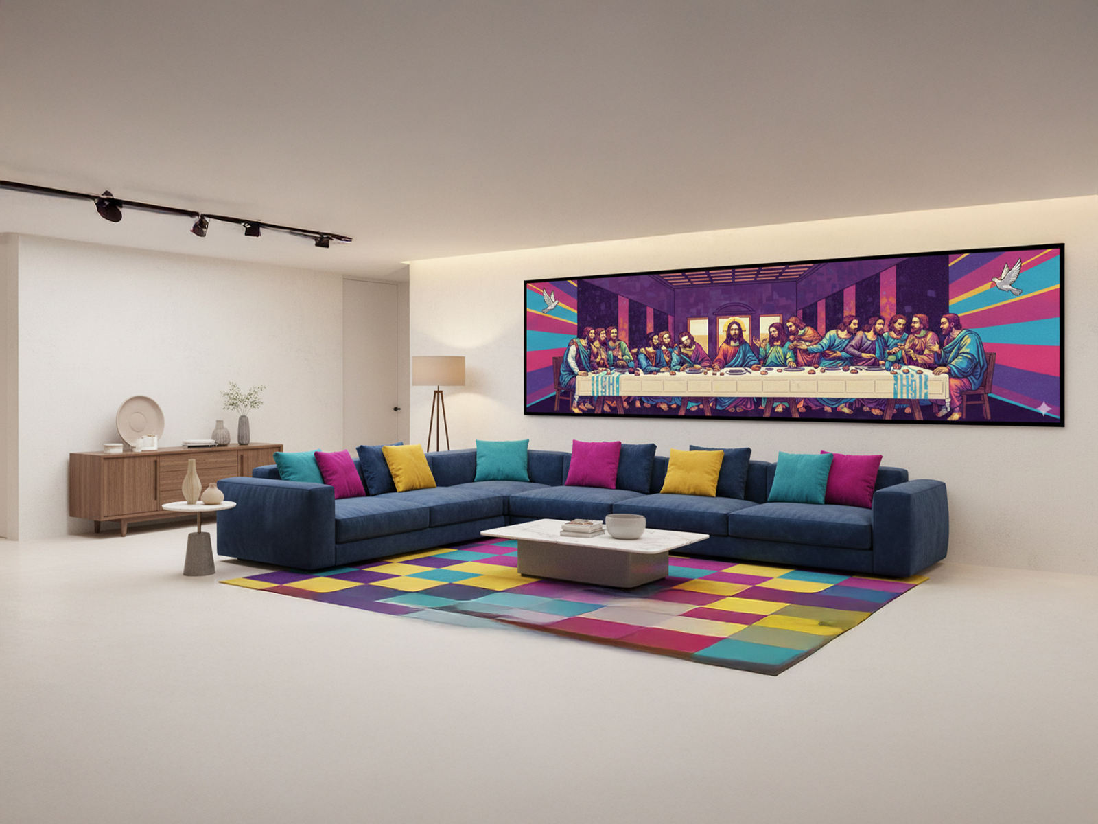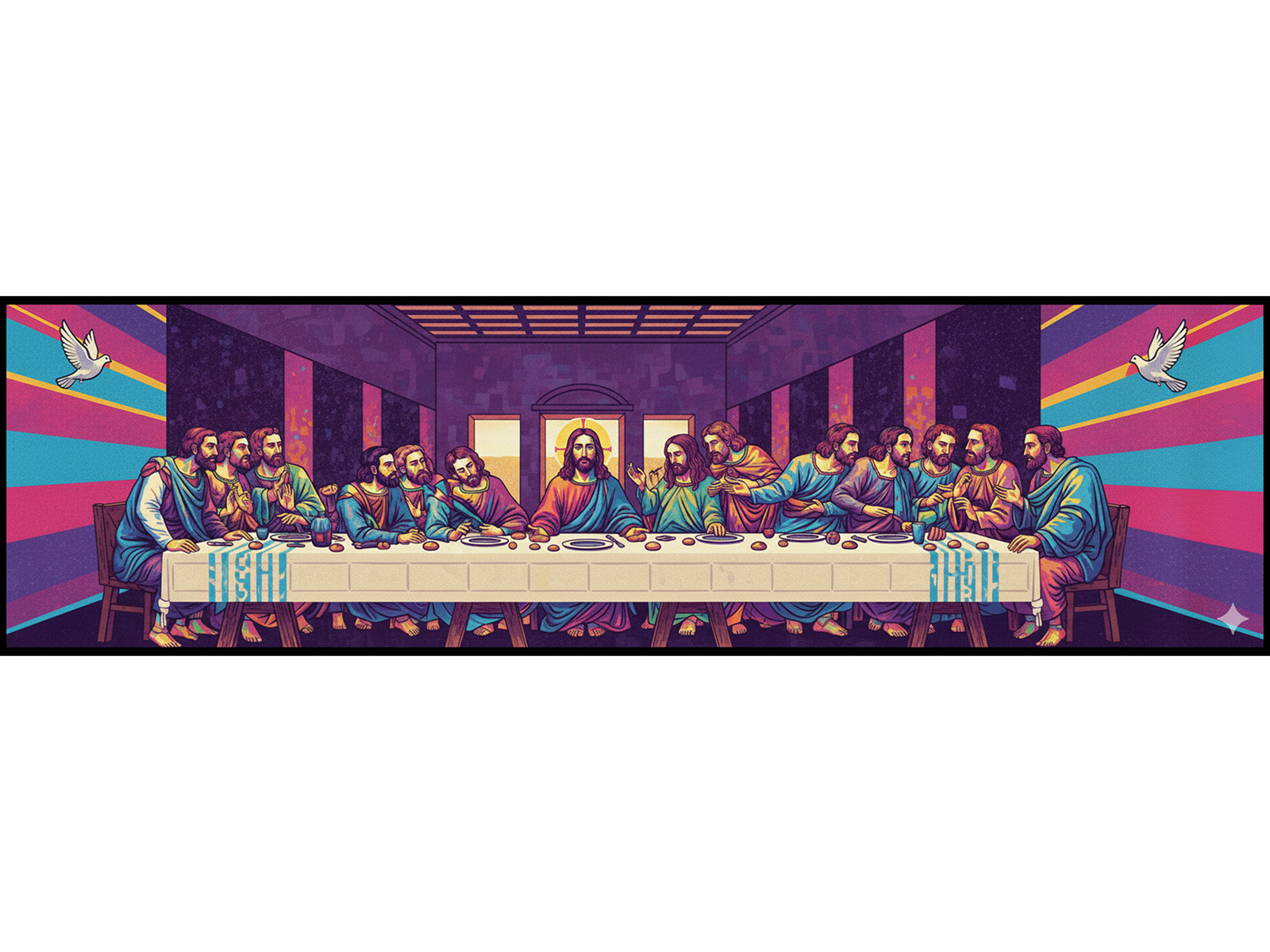 Os apóstolos e Jesus aparecem com traços modernos, mantendo expressão e presença mesmo dentro de uma proposta visual futurista. O fundo exibe listras multicoloridas que trazem movimento e energia para a composição. Pombas brancas voam nas laterais e reforçam o símbolo da paz, conectando o tema sagrado ao olhar contemporâneo. “Santa Ceia Neon” mantém a solenidade do momento, mas apresenta o tema de forma ousada e inédita, criando uma peça perfeita para salas de jantar contemporâneas ou ambientes sofisticados.