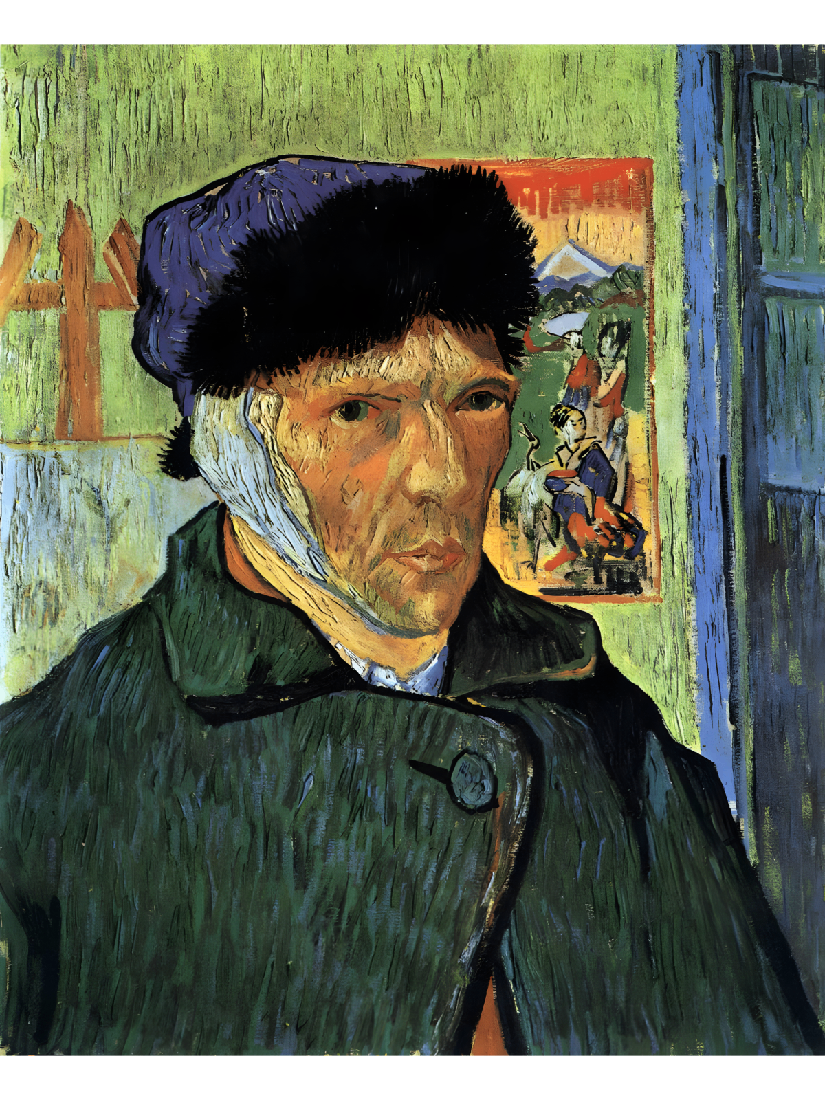 Self-Portrait with Bandaged Ear, de 1889, é uma obra de Vincent van Gogh. Ela é, sem dúvida, um dos autorretratos mais emblemáticos da história da arte. Nesta tela, o artista se retrata após o famoso episódio em que cortou sua orelha. Seu objetivo principal é explorar a expressão emocional e a introspecção. Para isso, Van Gogh utiliza a pintura como uma forma de autoanálise. Consequentemente, a obra transmite uma honestidade brutal e comovente.
