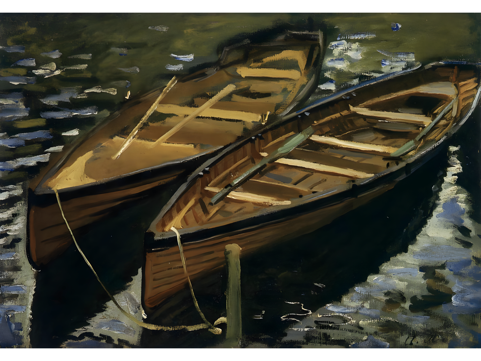 The Boats, de 1869, é uma obra de Claude Monet. Ela é, sem dúvida, um belo exemplo do início do Impressionismo. Nesta tela, o artista retrata pequenas embarcações ancoradas em um rio. Seu objetivo principal é capturar os efeitos sutis de luz e os reflexos na água. Para isso, Monet utiliza pinceladas soltas e uma sobreposição de tons. Consequentemente, a obra transmite movimento e uma atmosfera natural.