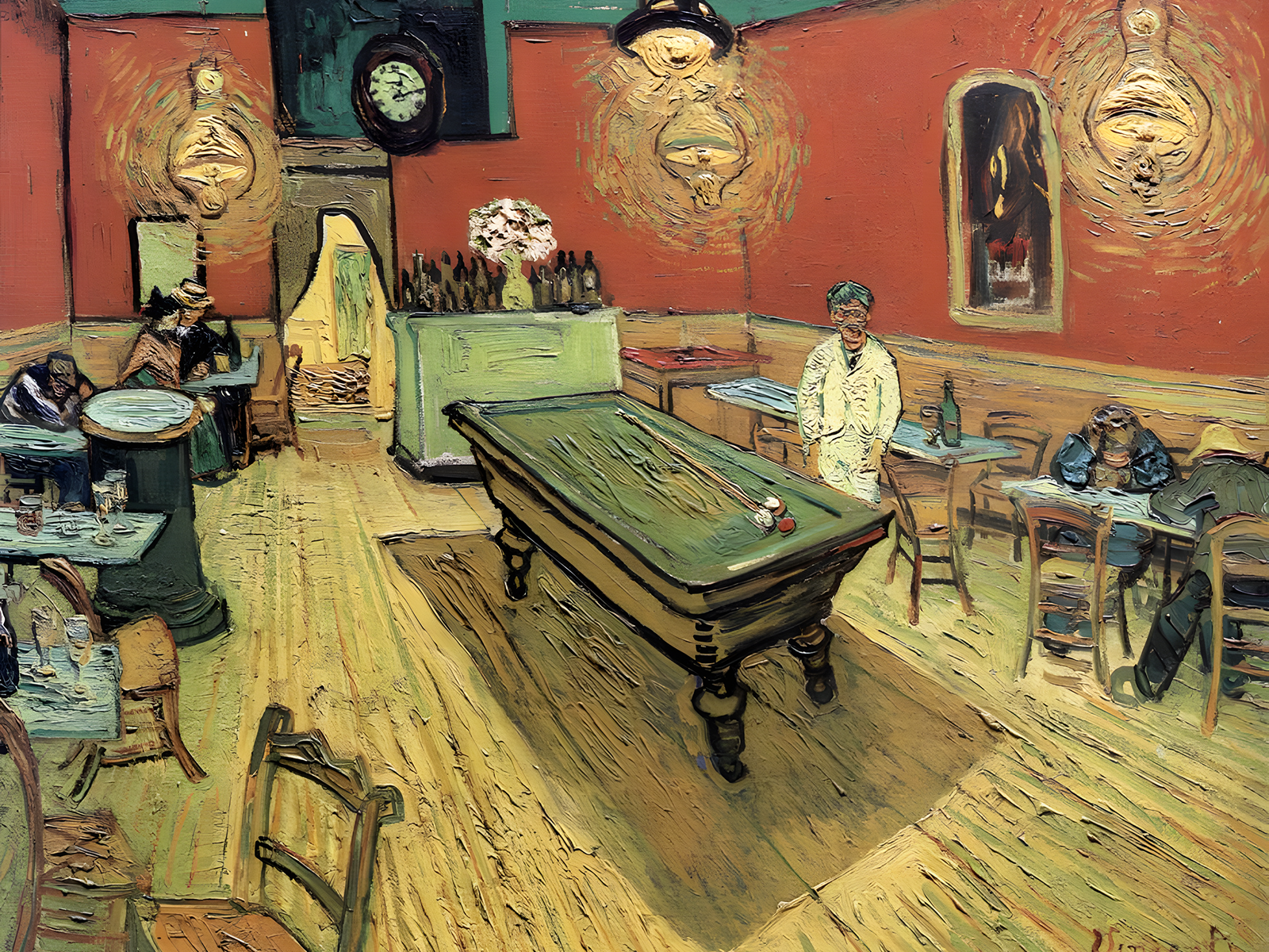 O artista utiliza a técnica de óleo sobre tela com pinceladas vibrantes. Ele combina, por exemplo, tons de vermelho e verde para criar um conflito visual. Além disso, a composição organiza os móveis de forma a gerar uma sensação de instabilidade. As poucas figuras humanas, por sua vez, parecem isoladas e perdidas no ambiente. Dessa forma, Van Gogh reforça a sensação de inquietação e angústia. The Night Café, portanto, é um retrato psicológico do espaço.