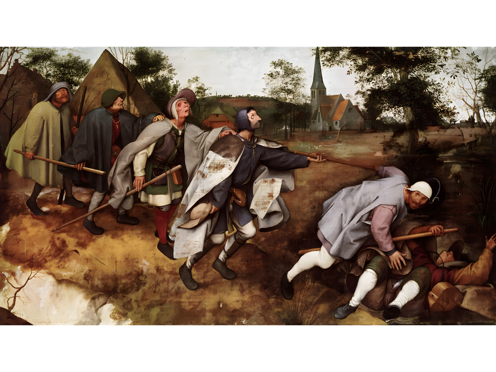The Parable of the Blind Leading the Blind, de 1568, é uma obra de Pieter Bruegel. Ela é, sem dúvida, representativa do Renascimento do Norte. Nesta tela, o artista retrata a parábola bíblica com um realismo implacável. Seu objetivo principal é explorar a cegueira, tanto física quanto espiritual. Para isso, Bruegel utiliza uma composição em diagonal que acentua a queda. Consequentemente, a obra serve como uma poderosa crítica social e moral.
