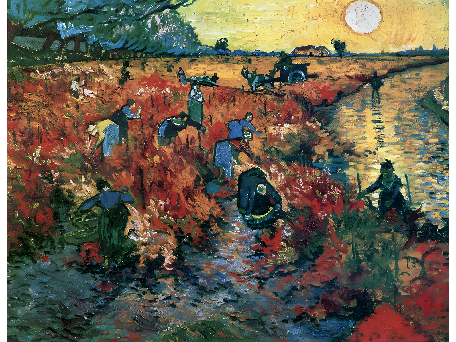 The Red Vineyard, de 1888, é uma obra-prima de Vincent van Gogh. Ela é, aliás, a única pintura que ele vendeu oficialmente durante sua vida. Nesta tela, o artista retrata a colheita de uvas em um vinhedo avermelhado. Seu objetivo principal é explorar a cor intensa e a luz dramática do outono. Para isso, Van Gogh utiliza pinceladas vigorosas e uma paleta de cores ousada. Consequentemente, a obra transmite a energia pulsante do trabalho rural.