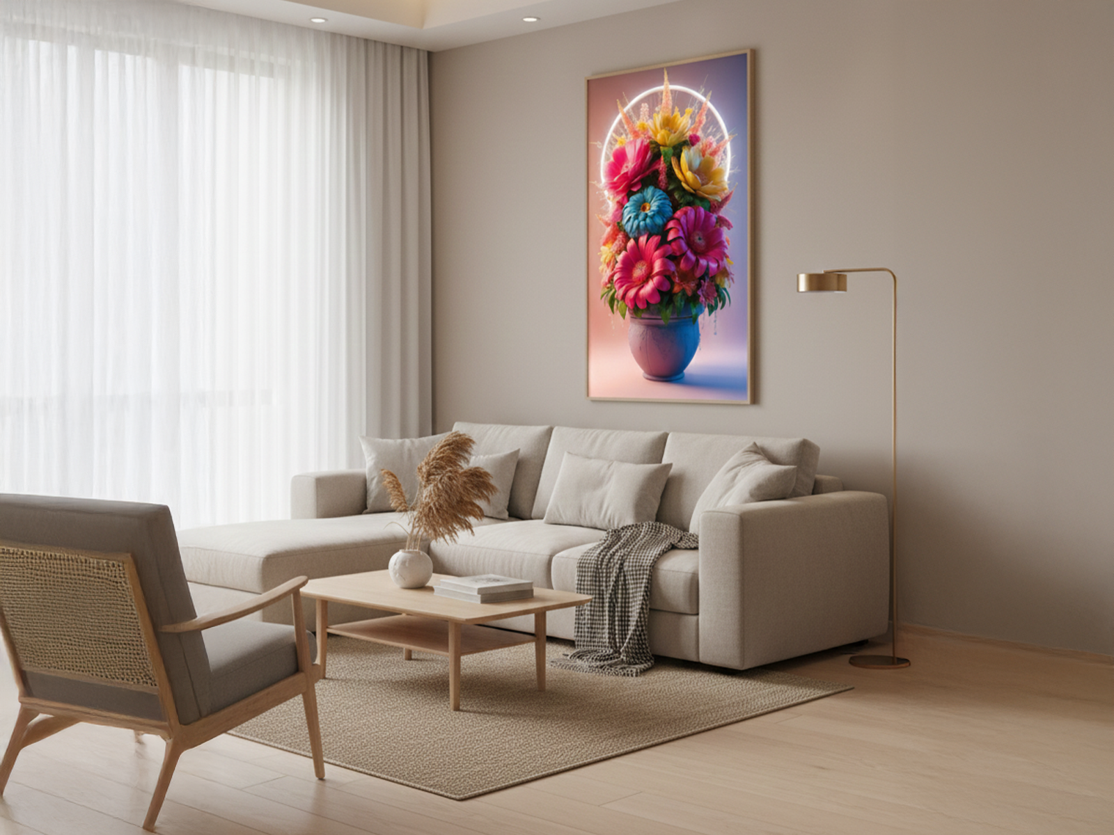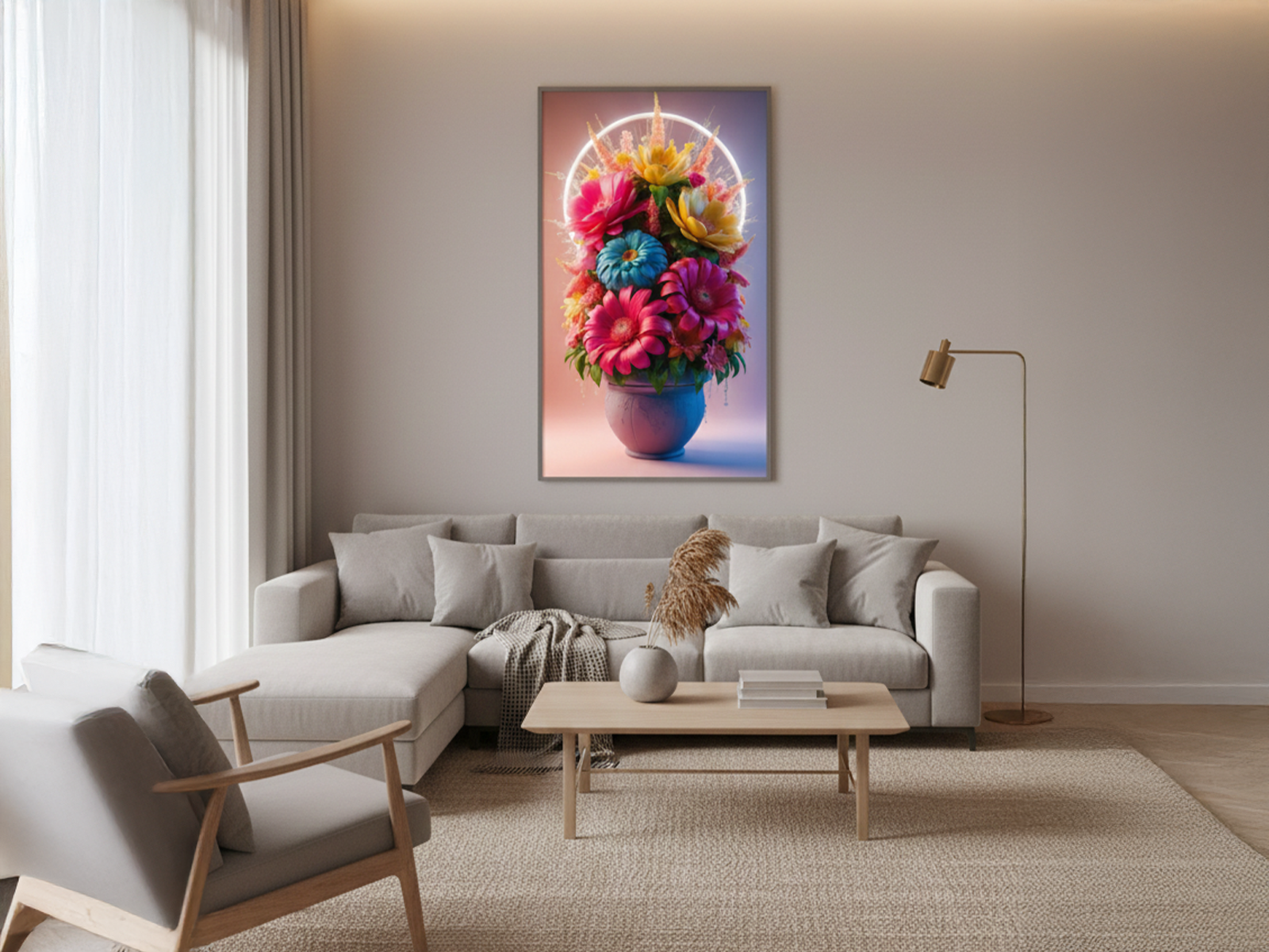 “Vaso Floral Neon” apresenta uma mistura ousada de cor e modernidade. Este quadro de flores mostra um arranjo exuberante em um vaso azul que ocupa o centro da composição. As pétalas surgem em tons vibrantes de rosa, azul e amarelo, criando um impacto imediato. Assim, gérberas e margaridas formam um conjunto dinâmico e cheio de energia. O grande destaque aparece logo atrás: um anel de luz neon envolve o buquê e cria uma atmosfera futurista. Portanto, a obra combina natureza e estética tecnológica sem perder a harmonia.